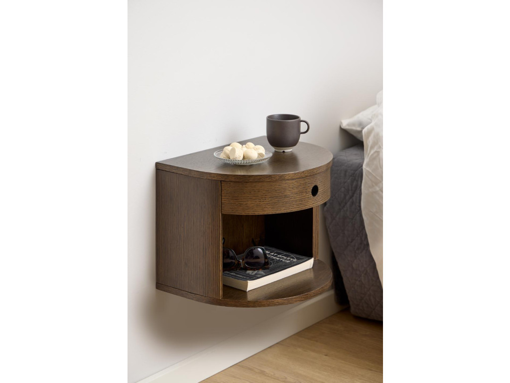 Nástenný nočný stolík Paron v prevedení zadymeného dubu upúta svojím elegantným polkruhovým tvarom a výraznou, hrejivou kresbou dubovej dyhy. Praktická zásuvka a otvorená priehradka poskytujú ideálny priestor na drobnosti, zatiaľ čo lakovaná povrchová úprava zvýrazňuje prirodzenú textúru dreva. Vďaka nástennej montáži pôsobí stolík vzdušne a moderne, ideálny pre štýlové aj útulné spálne.