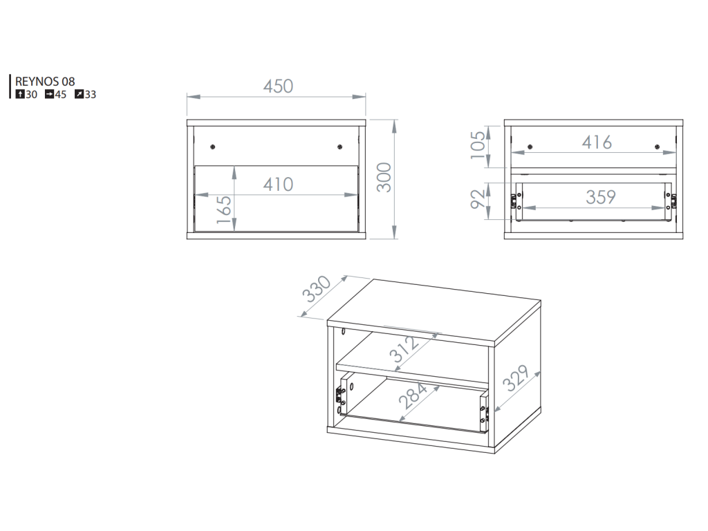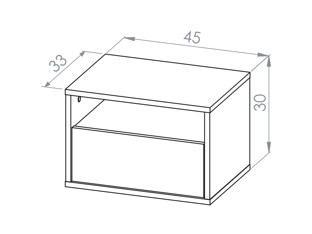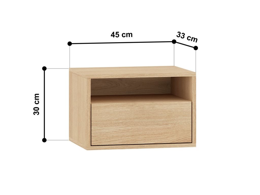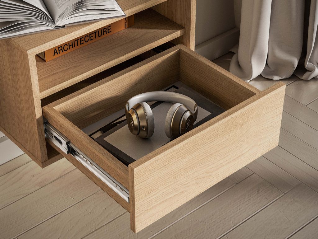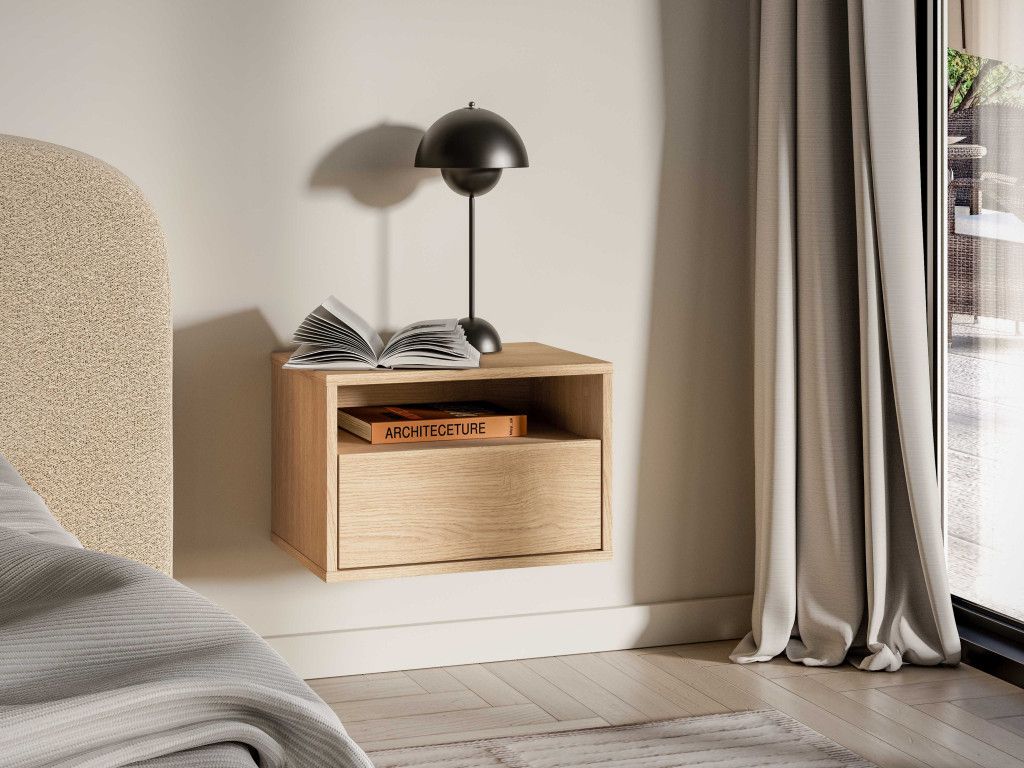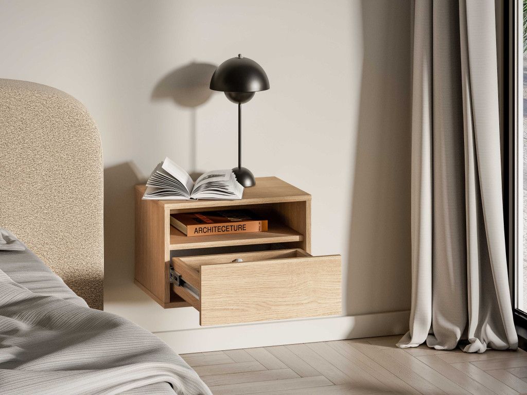 Závesný nočný stolík Reynos 08 je navrhnutý pre maximálnu jednoduchosť a praktickosť v spálni. Ponúka otvorenú priehradku na drobnosti, ktoré chcete mať vždy po ruke. Doplnený je o priestrannú zásuvku s plným výsuvom, ideálnu na uschovanie osobných vecí. Montáž na stenu vytvára efekt ľahkosti a opticky zväčšuje priestor. Minimalistický vzhľad v dekore dub mavelie a bezúchytkové prevedenie dopĺňa kvalitné spracovanie odolné pri každodennom používaní.