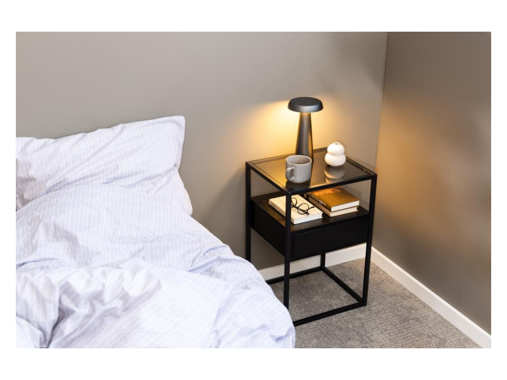Nočný stolík Randolf v sivom prevedení je praktickým a dizajnovým doplnkom do spálne. Údené sklo a čierna oceľová konštrukcia doplnená o otvorenú priehradku vytvárajú elegantný a funkčný celok.