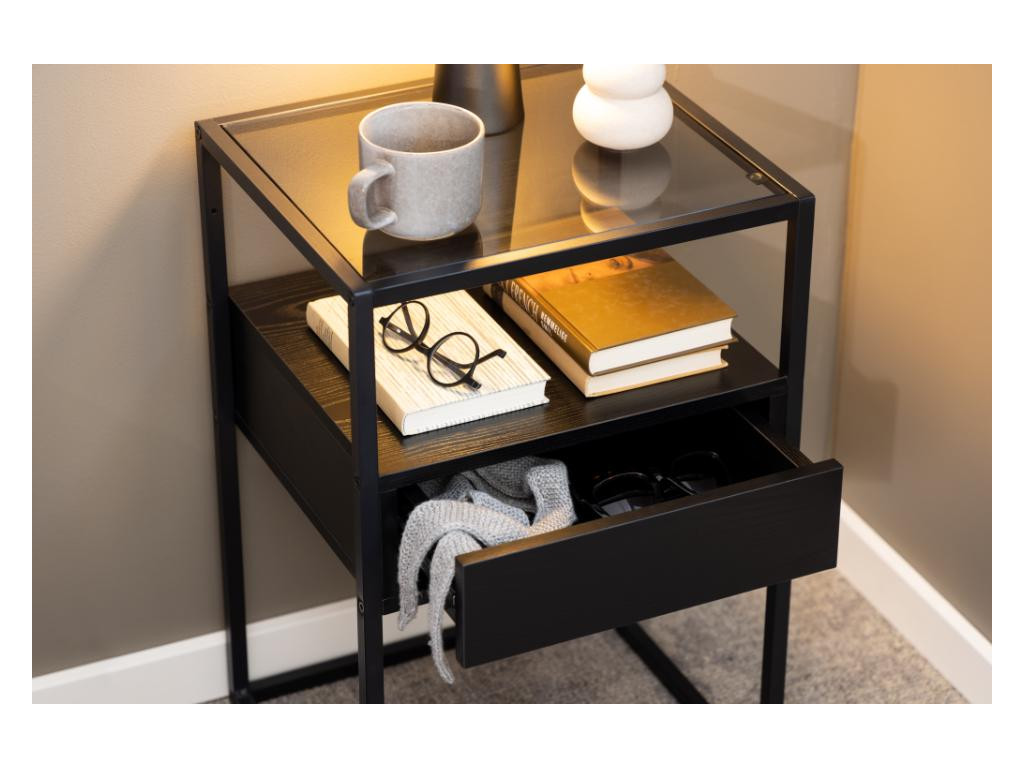 Tento model poskytuje šikovný úložný priestor vďaka zásuvke a otvorenej polici, pričom horná sklenená doska slúži na vystavenie dekorácií alebo osobných vecí.