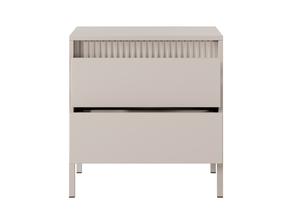 Nočný stolík Senso v matnej béžovej farbe zaujme moderným a čistým vzhľadom. Dve zásuvky s otváraním push to open ponúkajú praktický priestor na drobnosti, ktoré chcete mať poruke. Vysoké kovové nožičky uľahčujú čistenie aj pre robotické vysávače. Stolík sa hodí do minimalistických aj glamour interiérov.