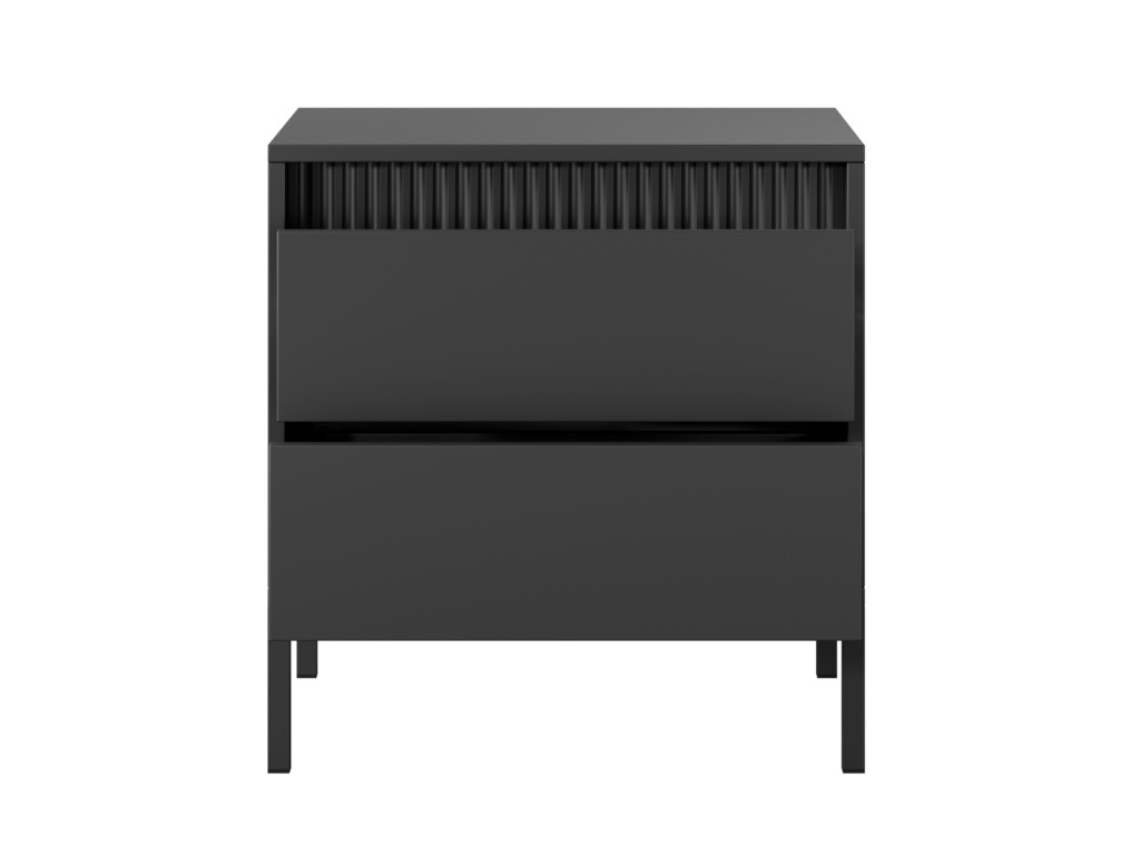 Čierny nočný stolík Senso dodá spálni elegantný a nadčasový charakter s výrazným výzorom. Dve praktické zásuvky s mechanizmom push to open umožňujú pohodlné a tiché otváranie bez úchytiek. Vysoké kovové nožičky zabezpečujú ľahkú údržbu pod nábytkom aj pre robotické vysávače. Ideálny do moderných, industriálnych či glamour interiérov.