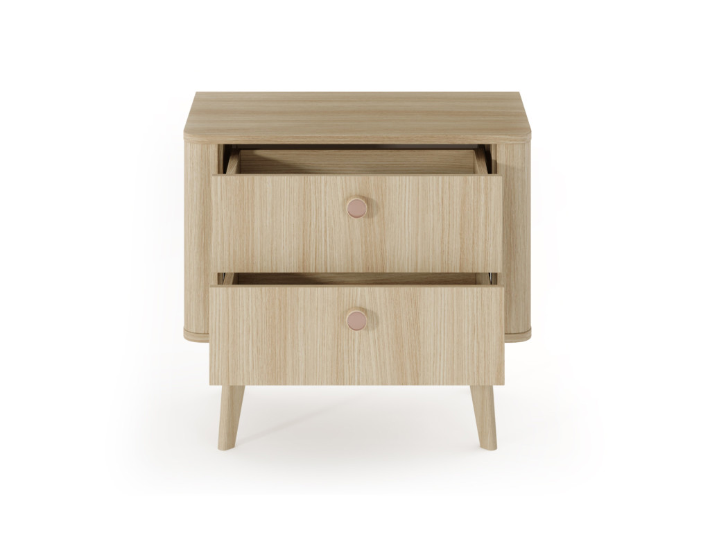 Nočný stolík Viki E je praktickým a štýlovým doplnkom ku posteli z kolekcie Viki, navrhnutý s dôrazom na útulnosť, jemné detaily a funkčnosť. Ponúka dve zásuvky s plnovýsuvom, ktoré umožňujú ľahký a tichý prístup k uloženým drobnostiam – ideálne na knihy, okuliare, nabíjačku či iné každodenné potreby. Povrch v dekore dub barista pôsobí hrejivo a elegantne, zatiaľ čo zaoblené línie, drevené úchytky s moka akcentom a stabilné drevené nožičky dodávajú stolíku jemnosť a prirodzený šarm. Dokonale zapadne do spálne s dôrazom na rovnováhu medzi štýlom a pohodlím.