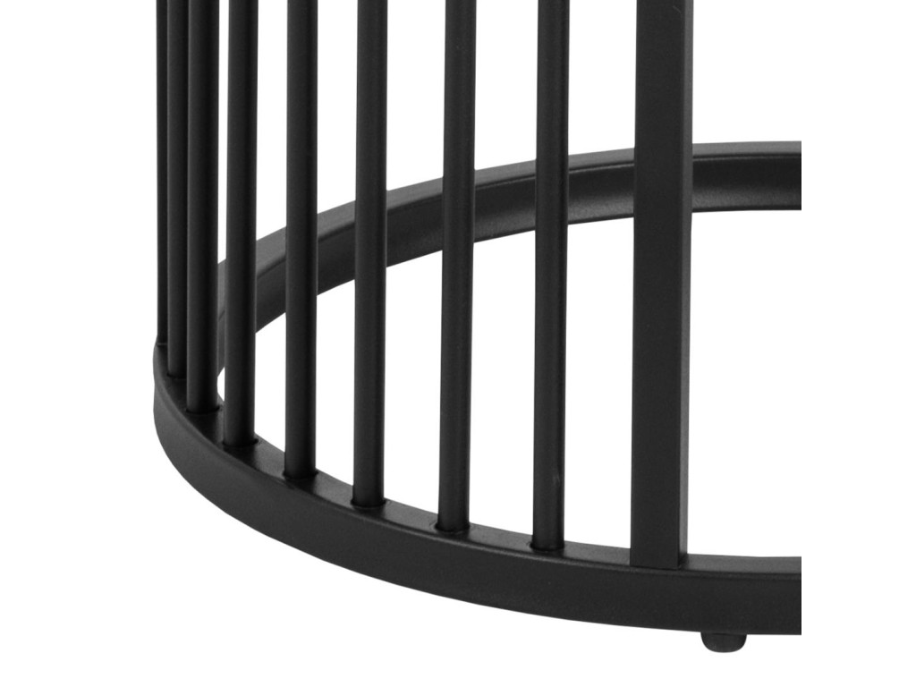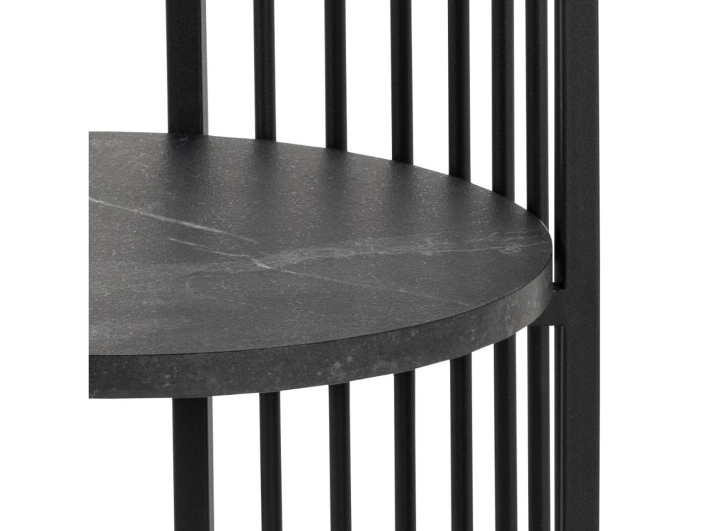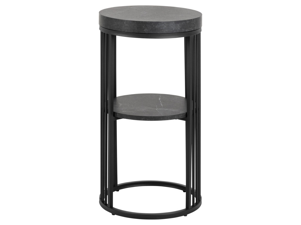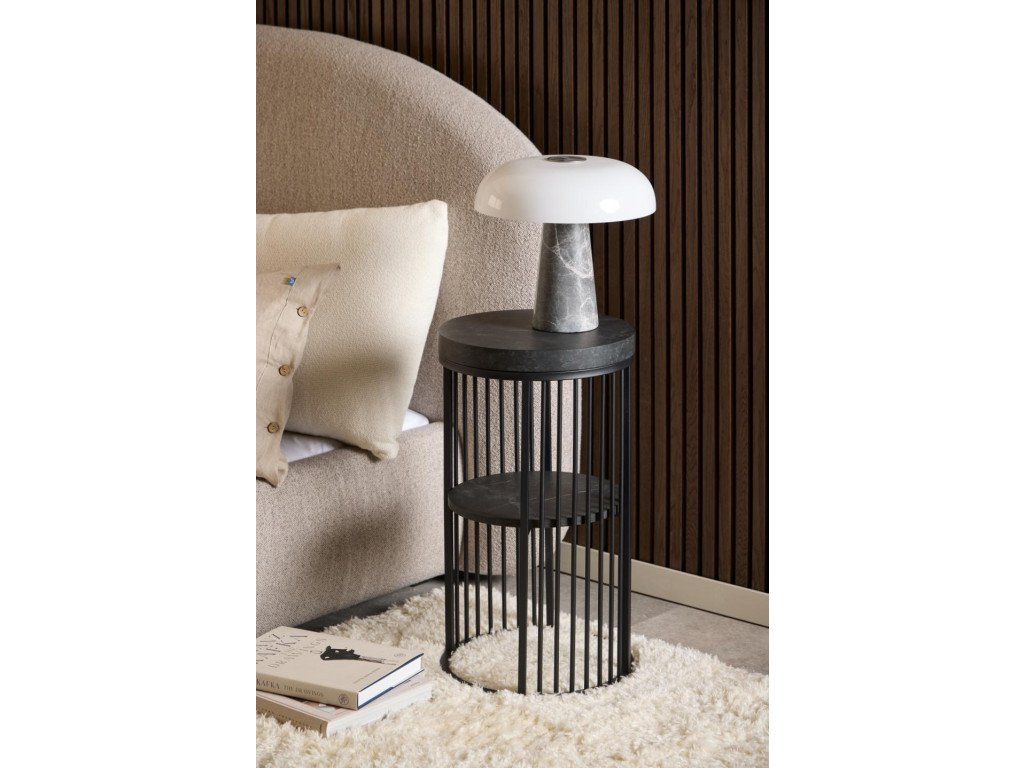 Okrúhly nočný stolík Strington zaujme už na prvý pohľad svojou architektonickou formou, ktorá pripomína stĺp súčasnej modernej architektúry. Jeho vrchná doska a polica s čiernym mramorovým vzhľadom pôsobia sofistikovane, zatiaľ čo zvislé drôty drôteného rámu vytvárajú ilúziu objemu, no zároveň ponechávajú stolík vizuálne ľahkým. Tento výrazný dizajnový kúsok je ideálny ako nočný stolík do spálne, ale vďaka svojej výške a elegancii poslúži aj ako príručný stolík v obývačke či hale.