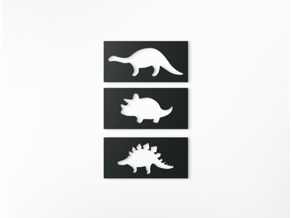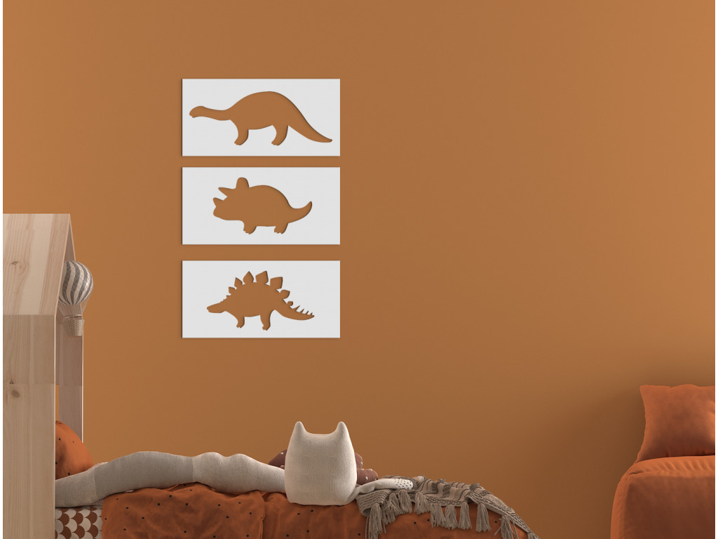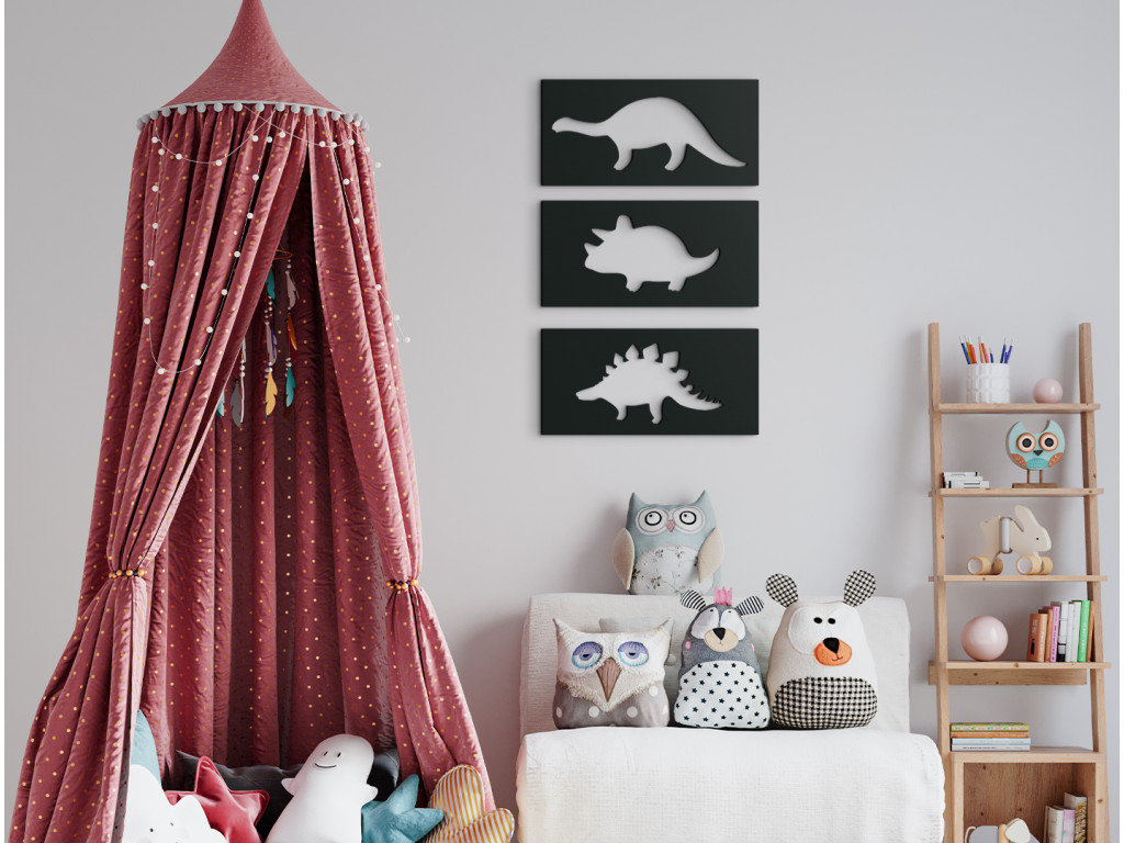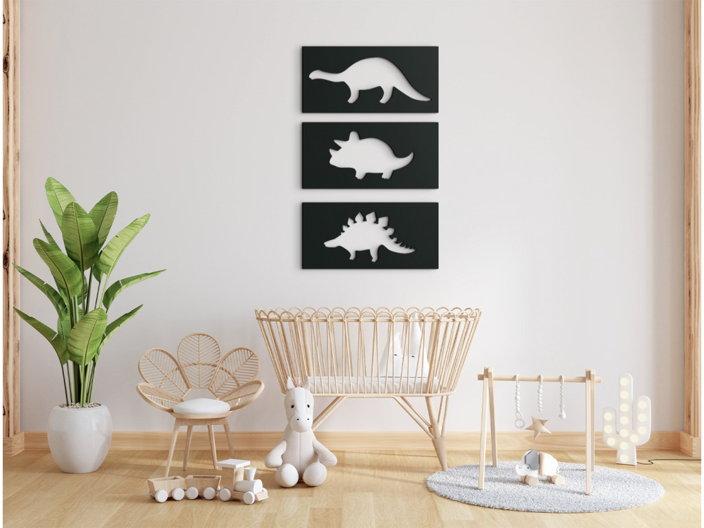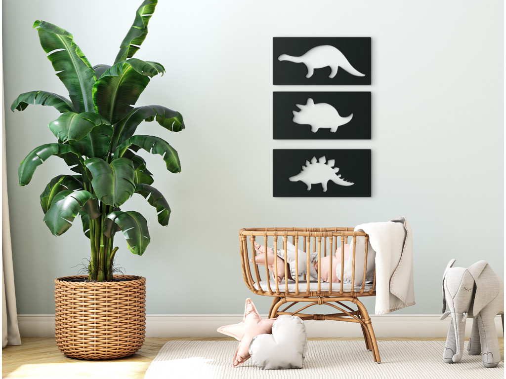 Moderný dizajn drevenej nálepky na stenu s motívom dinosaurov je vhodným doplnkom do chlapčenskej i dievčenskej izby. Hodí sa tiež ako univerzálny darček pre väčšie i menšie deti.
