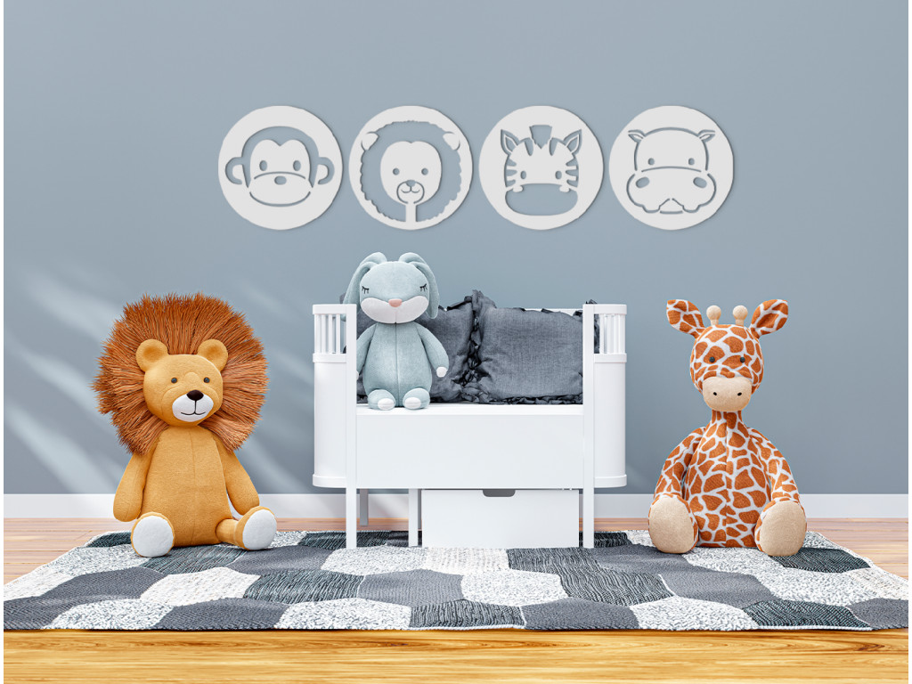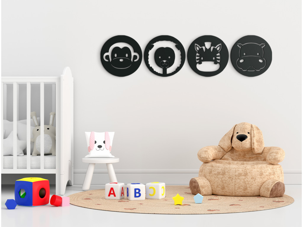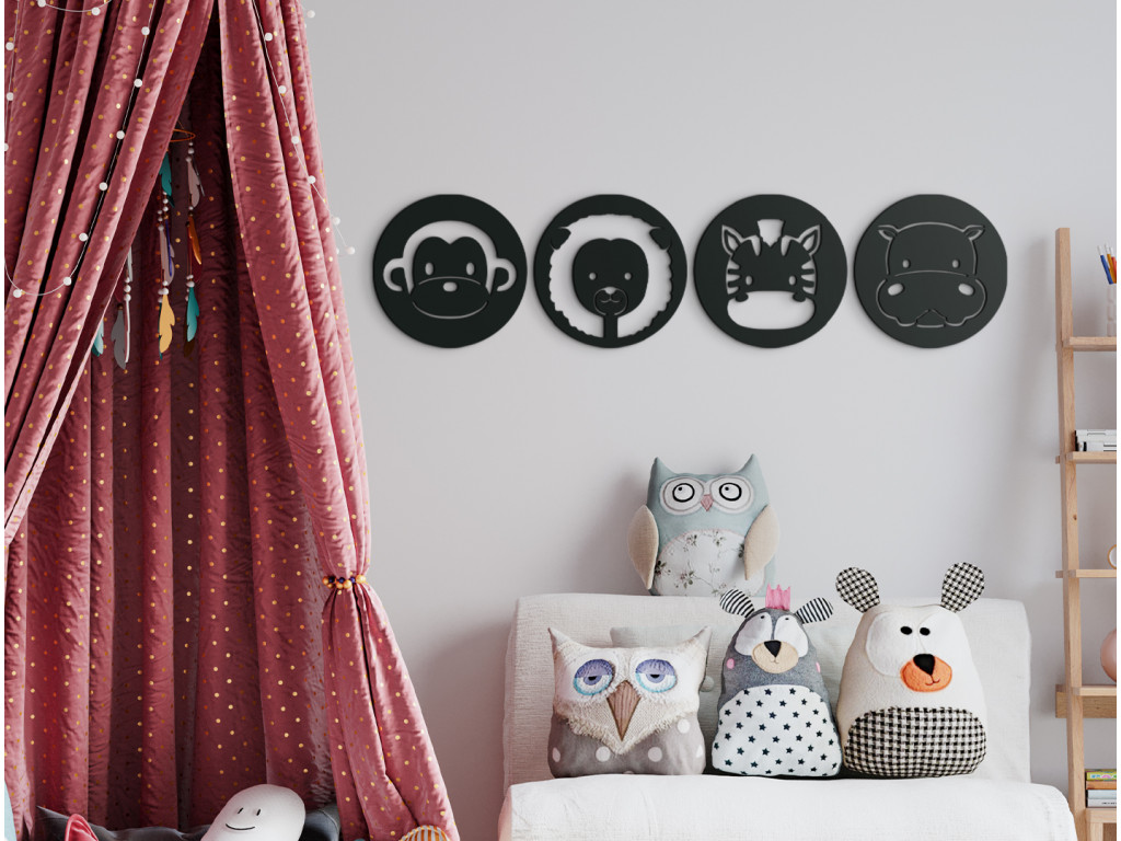 Štvordielny drevený obraz do detskej izby zobrazuje 4 druhy zvieratiek, s akými sa v našich zemepisných šírkach veru nestretnete. Každý z okrúhlych obrazov ponúka pohľad na hlavu jedného zvieratka: nájdeme tu opicu, leva, zebru i hrocha.