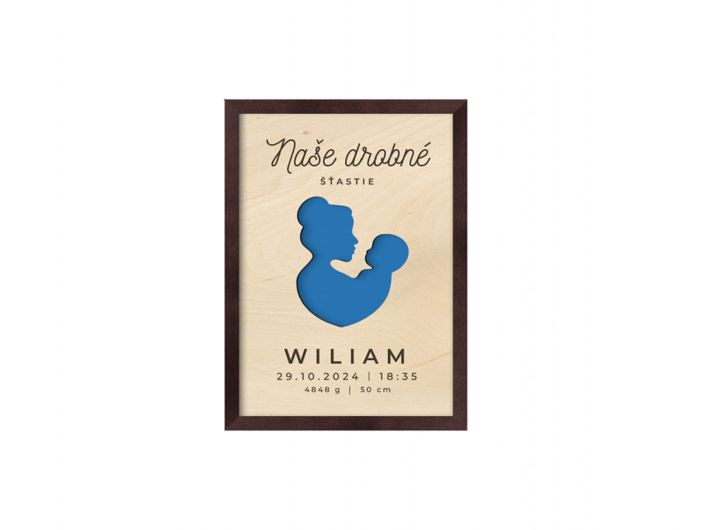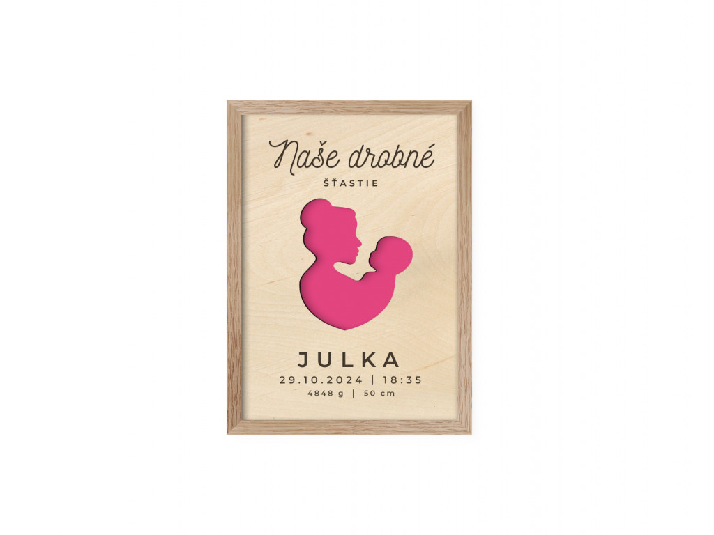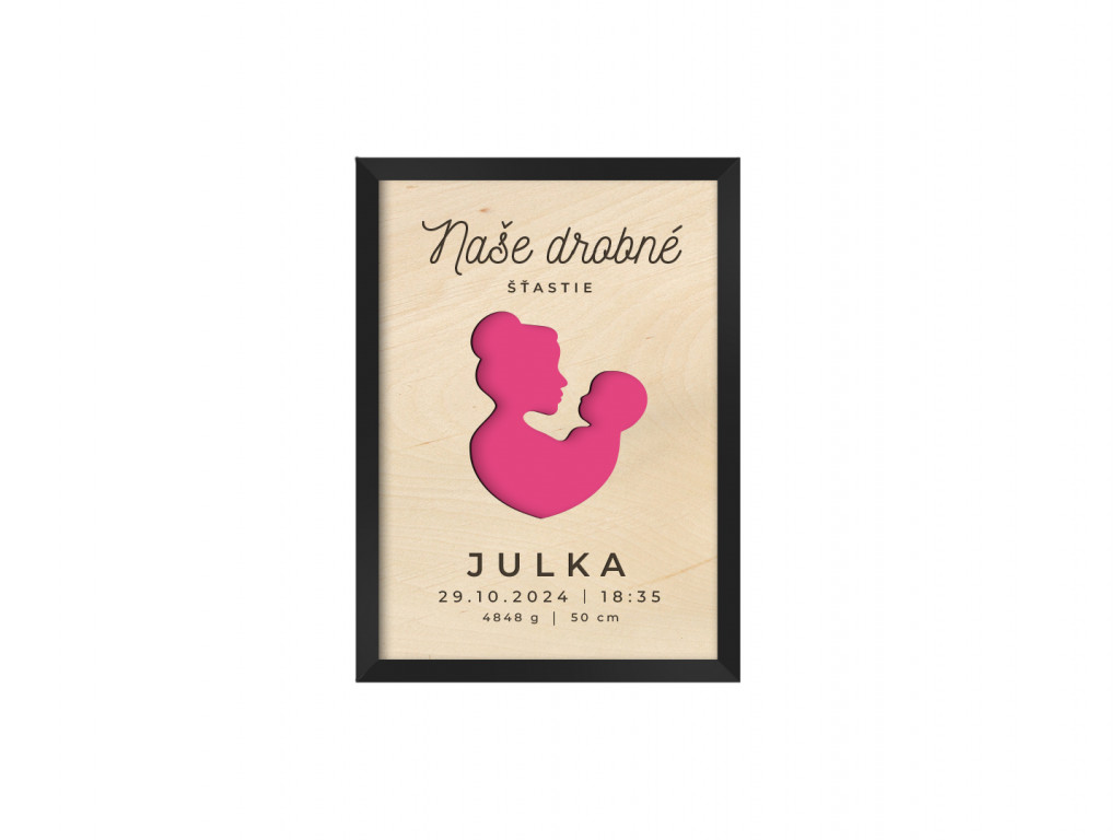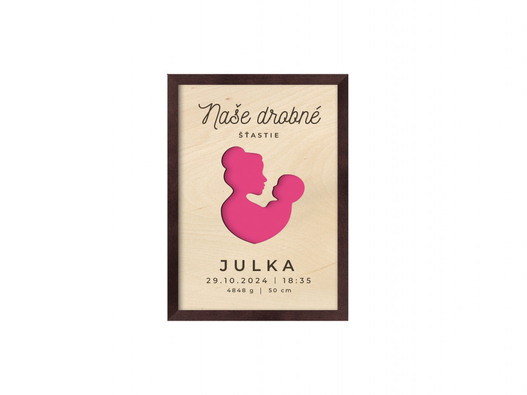 Jeden z najkrajších životných okamihov zarámujeme do milej drevenej dekorácie spolu s vygravírovanými údajmi bábätka. Meno, dátum a čas narodenia, výška aj váha tak nemusia byť iba záznamom v zdravotnej karte či pamäti pyšných rodičov. Hrdo si ich môžete vystaviť doma a postupne vyskladať kolekciu celej rozrastajúcej sa rodinky. Navyše, každý obraz farebne prispôsobíme vášmu vkusu.