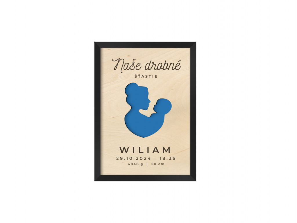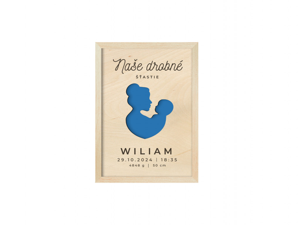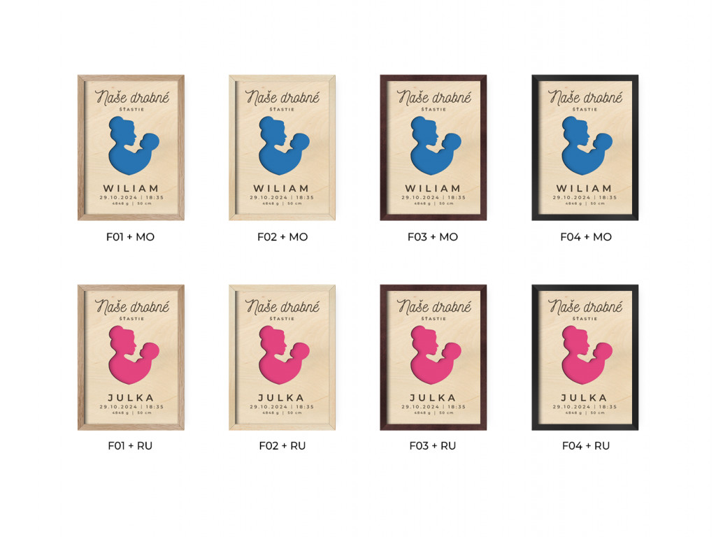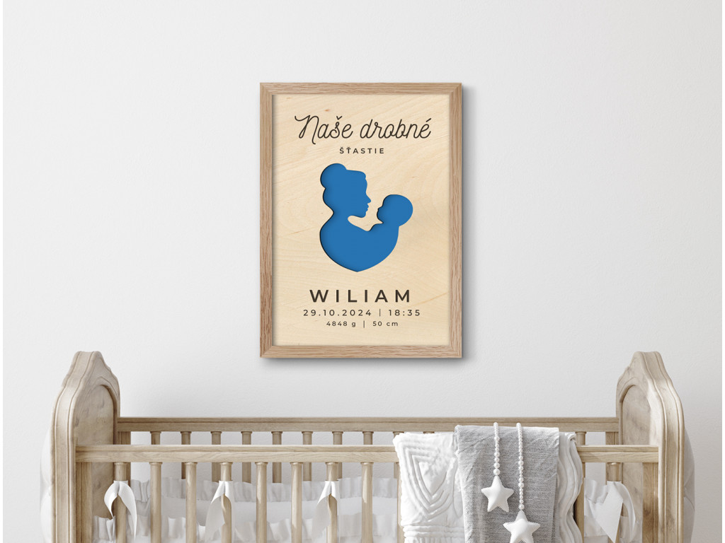 Jeden z najkrajších životných okamihov zarámujeme do milej drevenej dekorácie spolu s vygravírovanými údajmi bábätka. Meno, dátum a čas narodenia, výška aj váha tak nemusia byť iba záznamom v zdravotnej karte či pamäti pyšných rodičov. Hrdo si ich môžete vystaviť doma a postupne vyskladať kolekciu celej rozrastajúcej sa rodinky. Navyše, každý obraz farebne prispôsobíme vášmu vkusu.