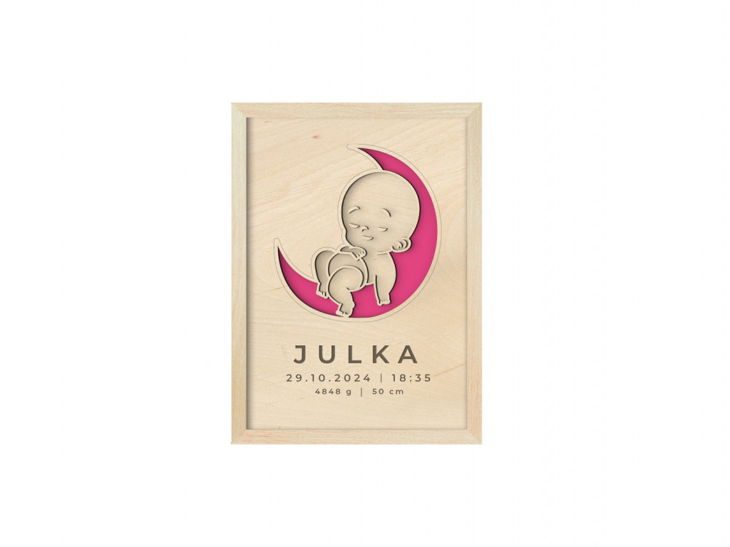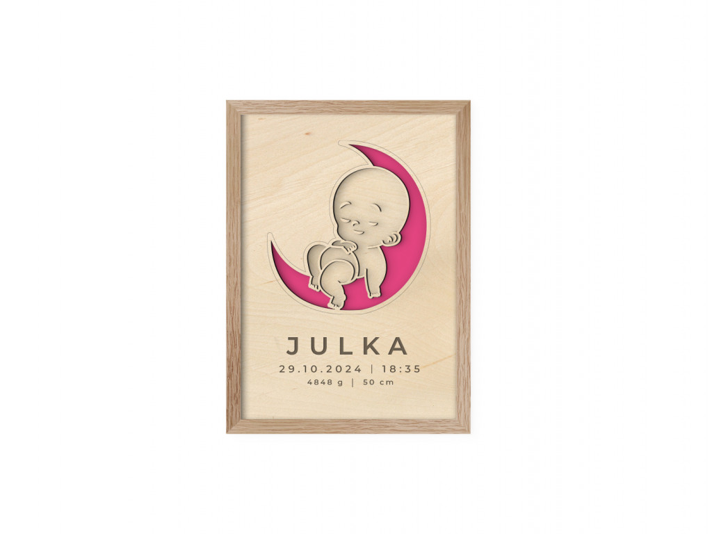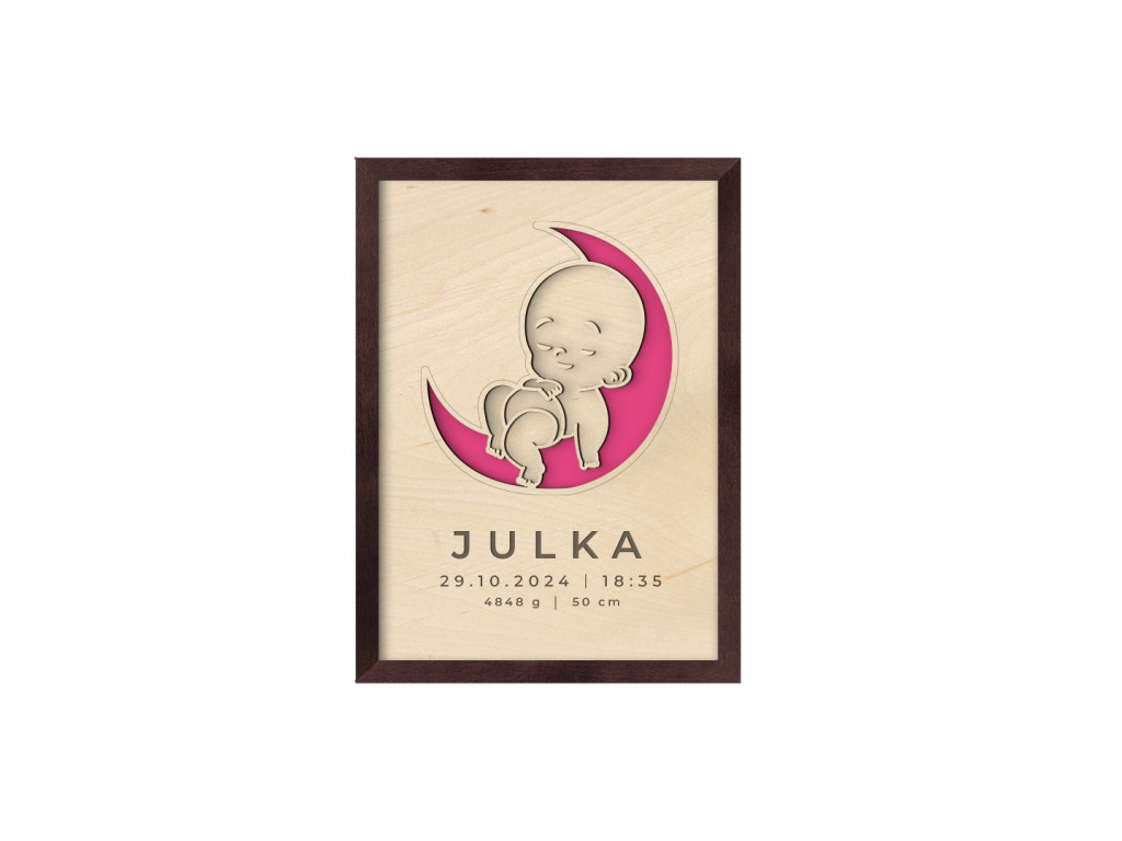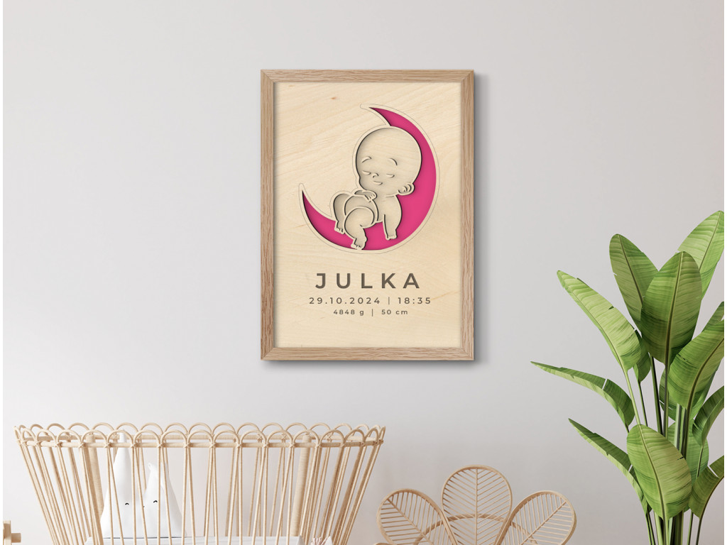 Jeden z najkrajších životných okamihov zarámujeme do milej drevenej dekorácie spolu s vygravírovanými údajmi bábätka. Meno, dátum a čas narodenia, výška aj váha tak nemusia byť iba záznamom v zdravotnej karte či pamäti pyšných rodičov. Hrdo si ich môžete vystaviť doma a postupne vyskladať kolekciu celej rozrastajúcej sa rodinky. Navyše, každý obraz farebne prispôsobíme vášmu vkusu.