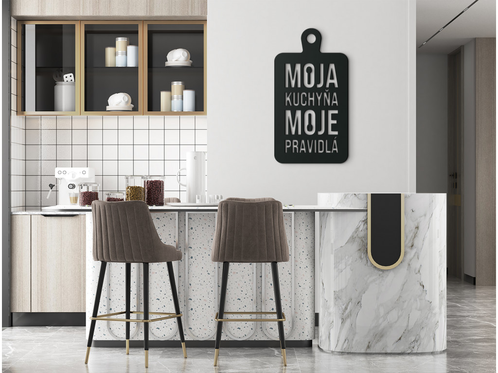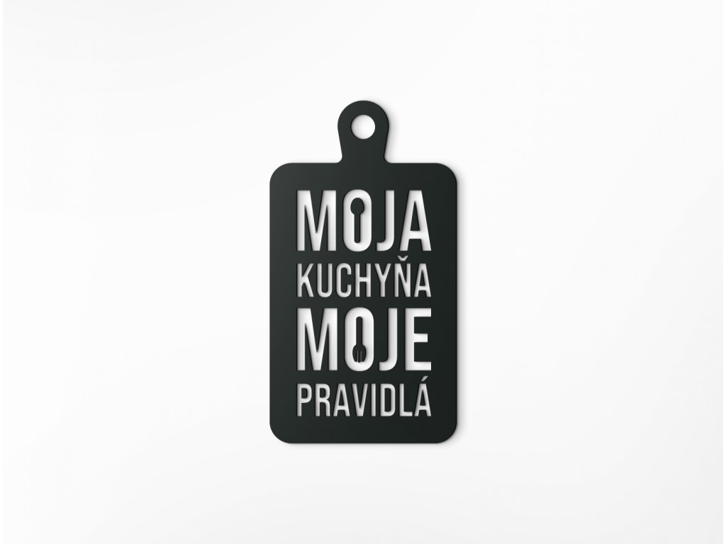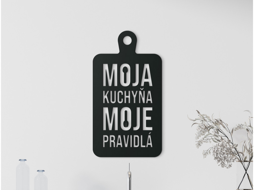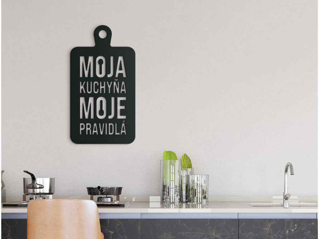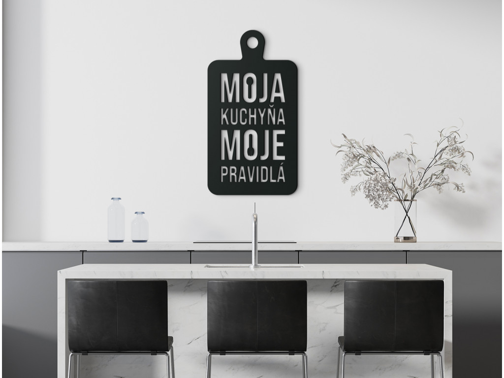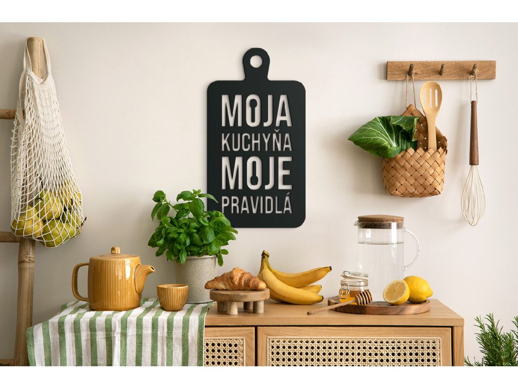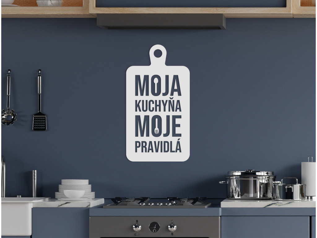 Ak hľadáte vhodnú tematickú dekoráciu s vtipným motívom do kuchyne, potom je nálepka Moja kuchyňa, moje pravidlá tým správnym výberom. Motív znázorňuje lopárik na krájanie, vďaka čomu ho môžete zavesiť nad jedálenský stôl či kuchynskú linku.