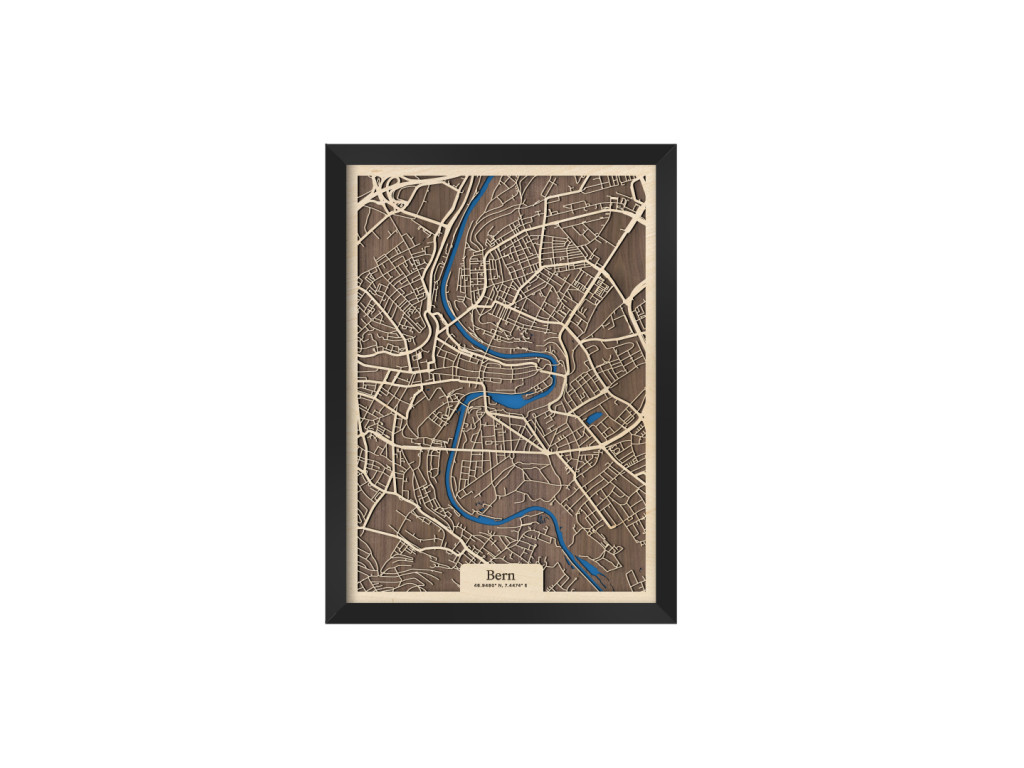 Oba brehy rieky Aare a tiež našu kolekciu drevko CITY zdobí malebný Bern. Toto politické centrum je štvrtým najväčším a federálnym mestom Švajčiarska - krajiny bez oficiálneho hlavného mesta. Drevená mapa Bern zarámuje centrum a časti ako Engeried, Länggasse, Lorraine, Altenberg, Rotes, Gelbes, Grünes, Weisses, Schwarzes Quartier, Monbijou, Sandrain, Kirchenfeld a mnohé ďalšie. Obraz Bernu môžete mať v 2 rozmeroch a ľubovoľnej farebnej kombinácií rámu a dosky.
