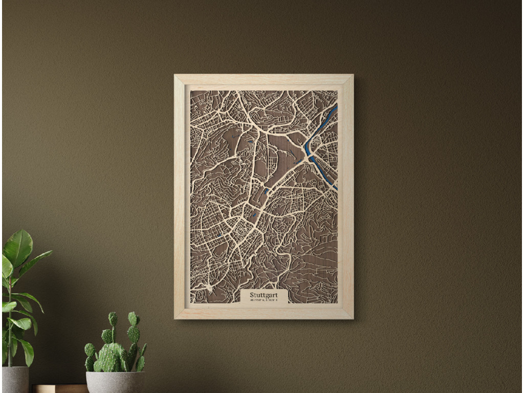 Na juhu Nemecka v blízkosti rieky Neckar a taktiež v našej kolekcii máp drevko CITY vyniká mesto Stuttgart. Ak sú Vám jeho ulice v častiach Nord, Mitte, Ost či Süd dobre známe, spomienku na ne si môžete uchovať navždy vďaka 3D dekorácii. Drevený obraz Stuttgart vám vyskladáme na mieru vo veľkosti a farbách podľa vlastného výberu.