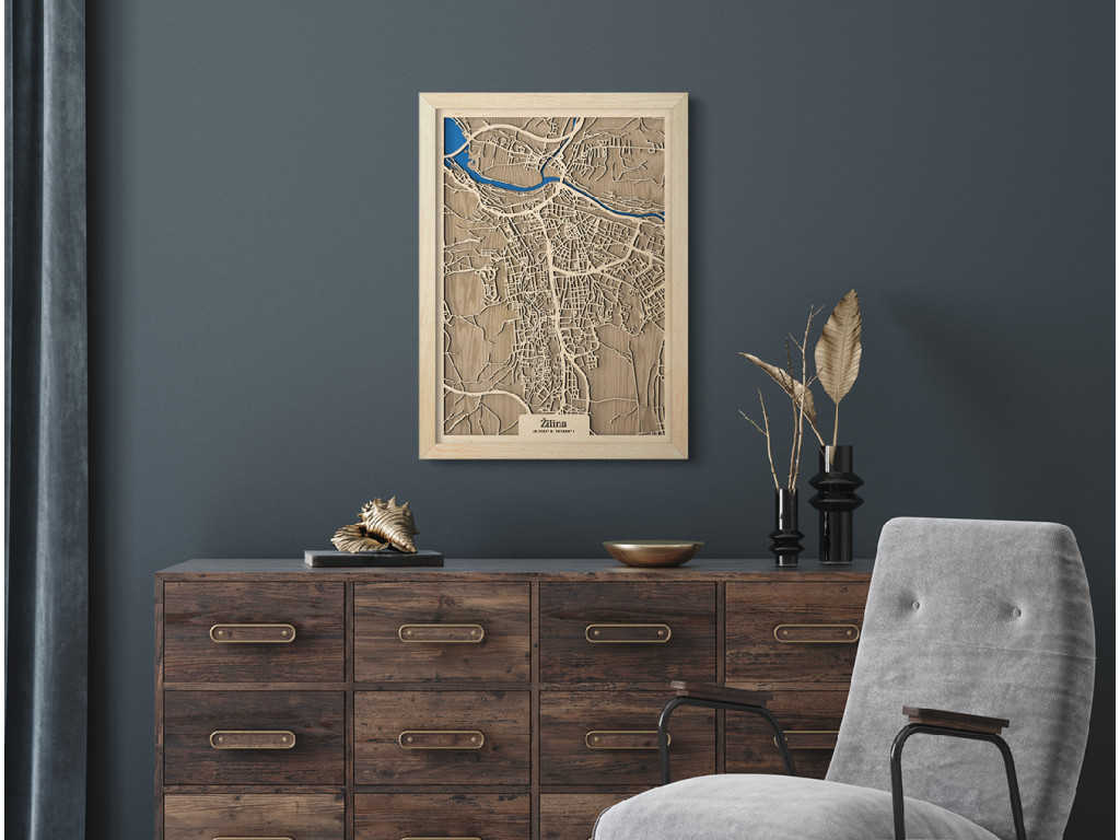 Poznáte Žilinu ako vlastnú dlaň? Tak schválne, či viete pomenovať všetky jej časti na obraze z kolekcie drevko CITY. Drevená mapa Žilina totiž zveční Staré mesto, Budatín, Strážov, Závodie, Hájik, Bánovú, Bôrik, Vlčince aj Solinky. Modrou farbou sú znázornené rieky Kysuca, Váh a vodné nádrže Strážov a Hričov. Ak vám 4. najväčšie mesto Slovenska prirástlo k srdcu, určite si nenechajte ujsť možnosť zavesiť si ho na stenu v dizajne podľa vlastného výberu.