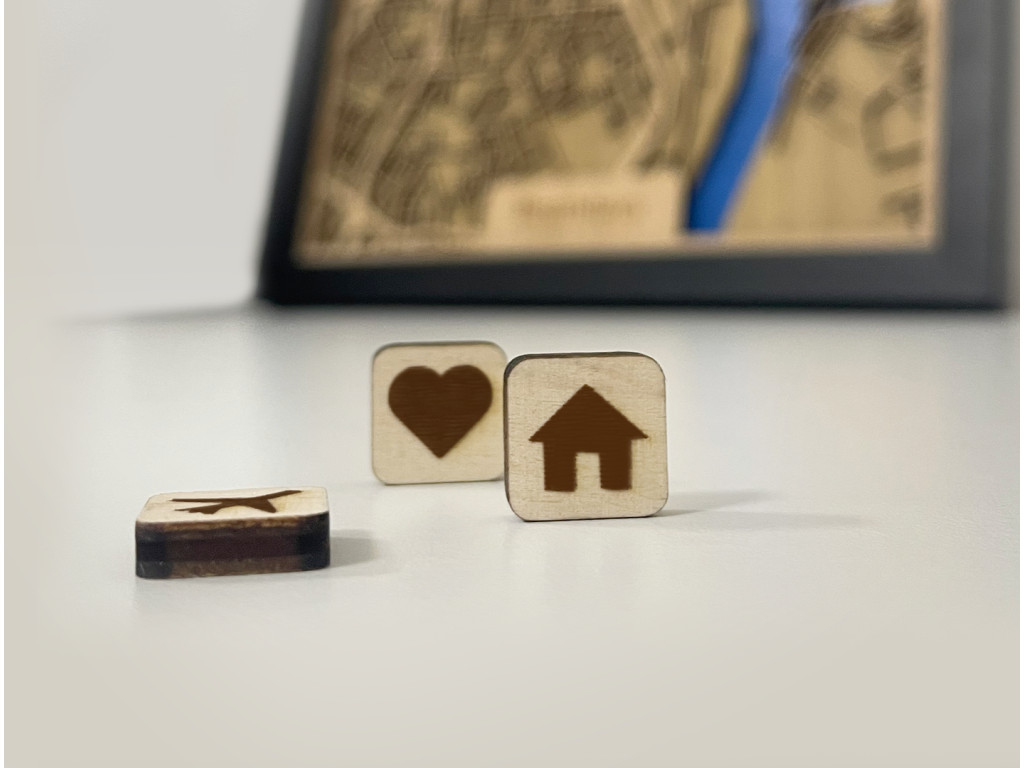 Oživte svoju drevenú mapu CITY jedinečnými ikonami – domček, srdce, poloha, prsteň, lietadlo a kostol. Dokonalý spôsob, ako označiť miesta plné významu a spomienok!