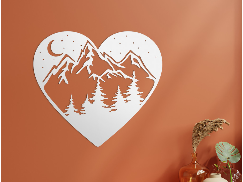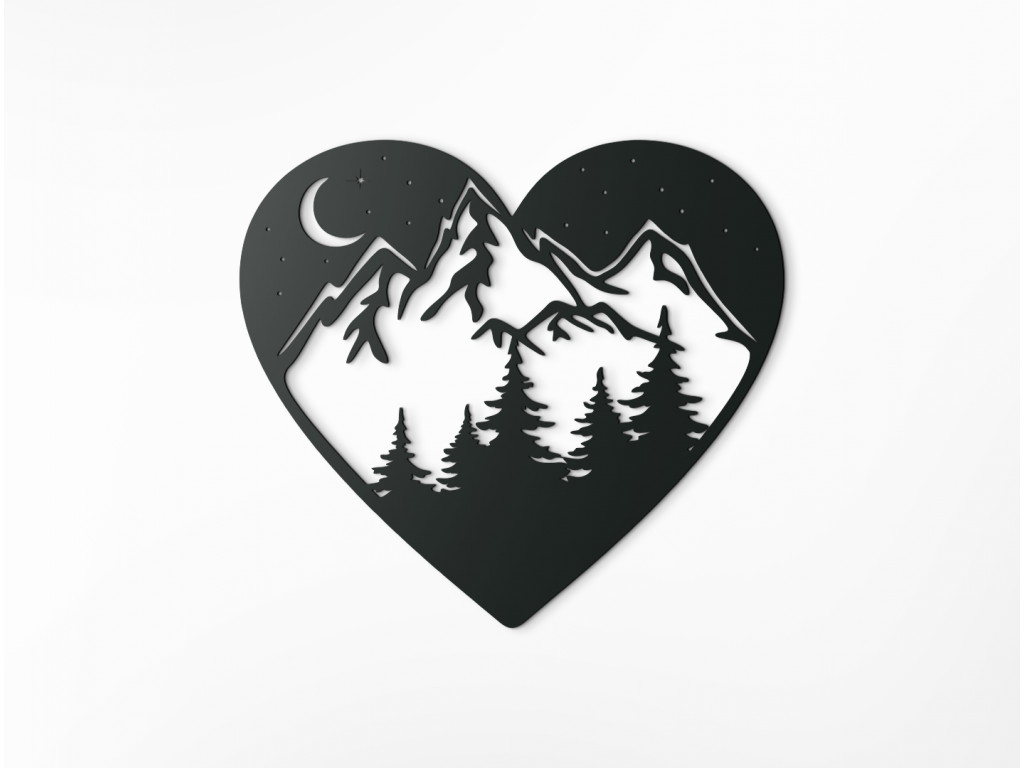 Pre romantické duše tu máme drevený obraz Noc nad horami. Obraz je v tvare srdca, ktoré mu dodáva jemnosť a originálnosť. Vnútri sa nachádzajú veľkolepé vrchy a les. Nad horami sa rozprestierajú nočné hviezdy a mesiac. Vybrať si môžete z viacerých farebných odtieňov a rozmerov.