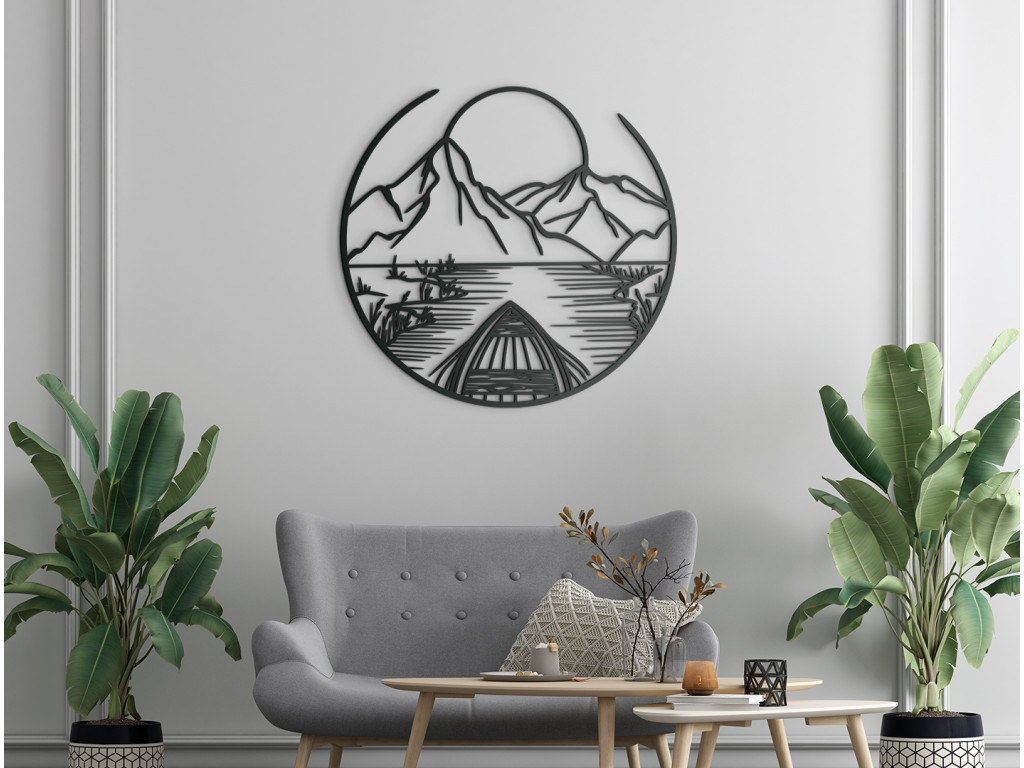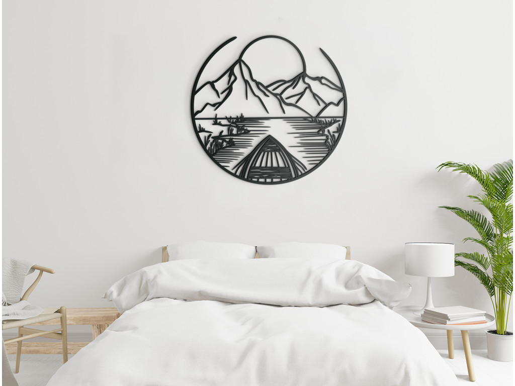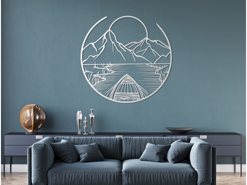 Drevený obraz Západ Slnka, na ktorom sa nachádza loďka smerujúca k horám. Jednoduchý dizajn z neho robí dekoráciu vhodnú do akejkoľvek izby. Obraz v minimalistickom dizajne je vyrobený z 3 mm HDF dosky. Vybrať si môžete z viacerých farebných prevedení.