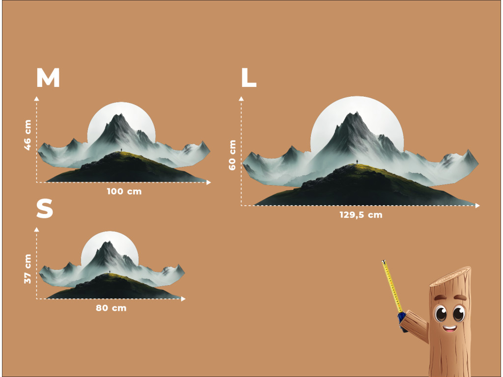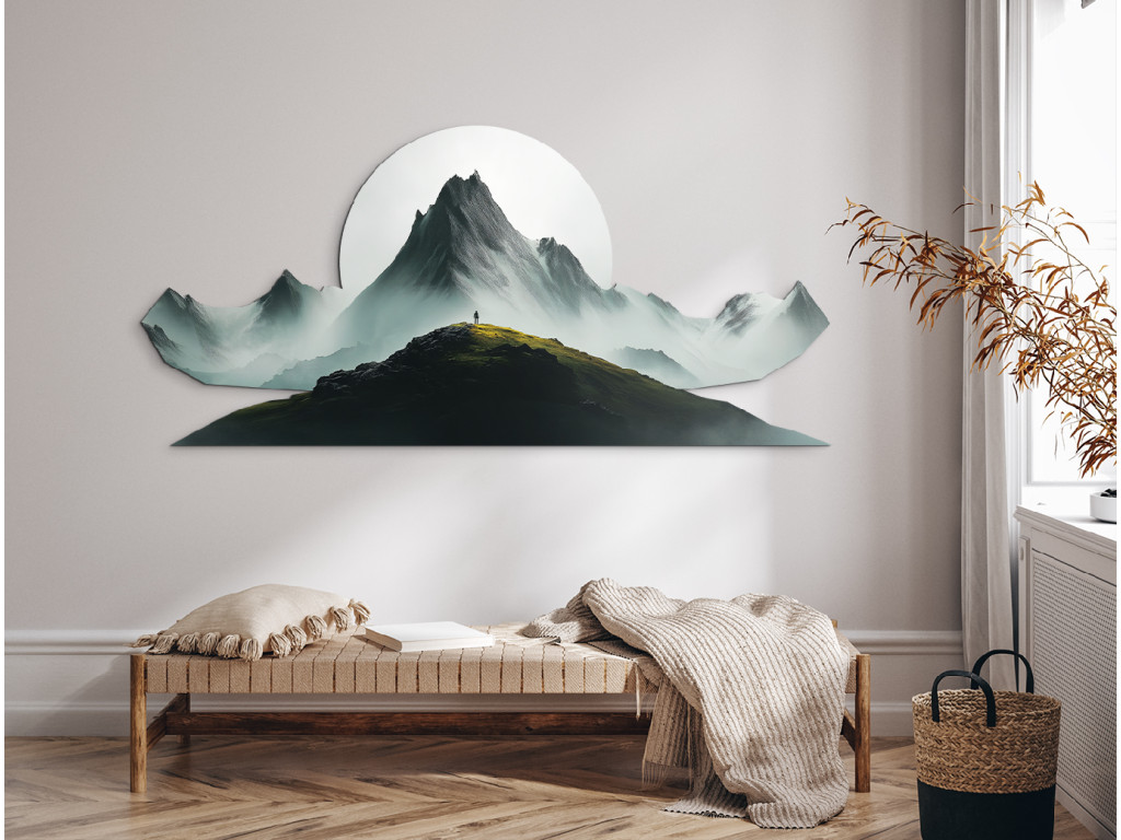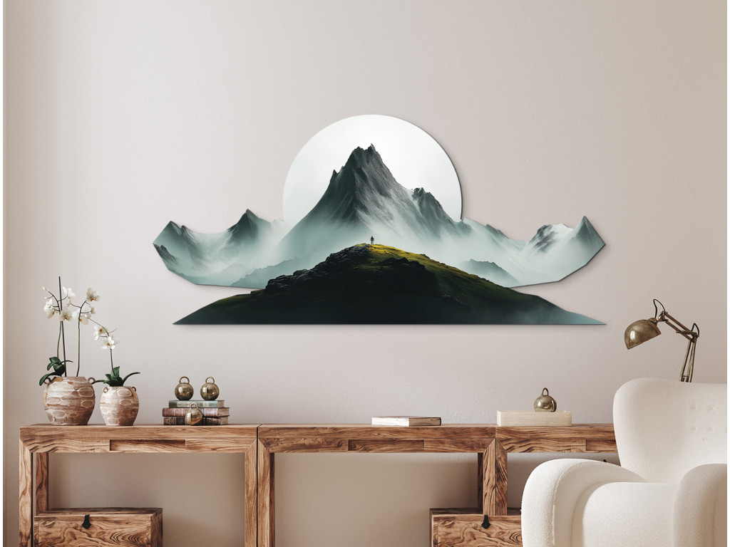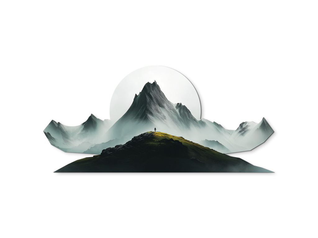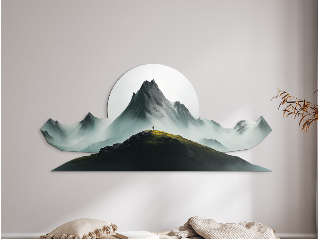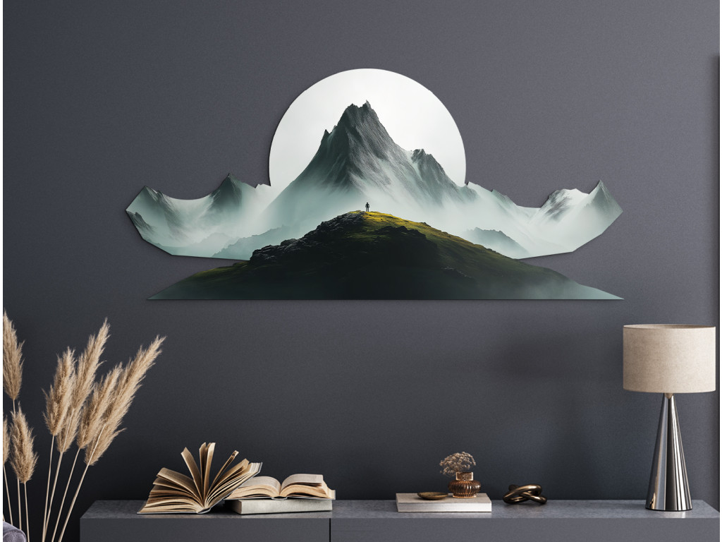 Pôsobivý obraz so siluetou človeka stojaceho na vrchole hory symbolizuje slobodu, odvahu a spojenie s prírodou. V pozadí sa tiahnu hmlisté horské masívy, ktoré vytvárajú hĺbku a pokoj. Dominantný biely kruh pripomínajúci slnko alebo mesiac dodáva dielu mystickú atmosféru a zvýrazňuje kontrast svetla a tieňa. Tento obraz je dokonalou voľbou pre tých, ktorí milujú dobrodružstvo a ticho hôr.