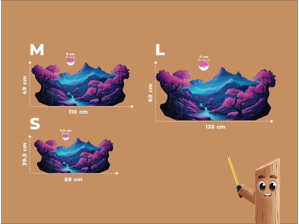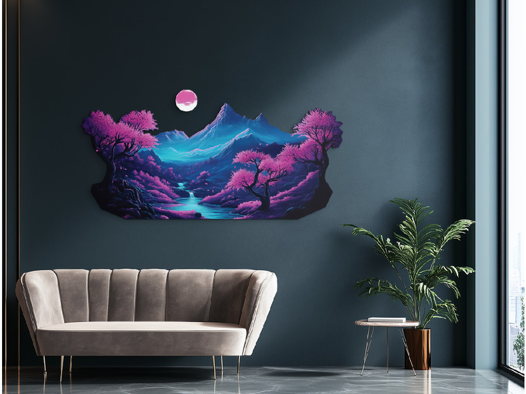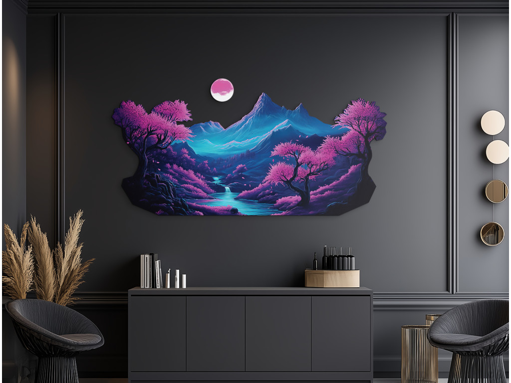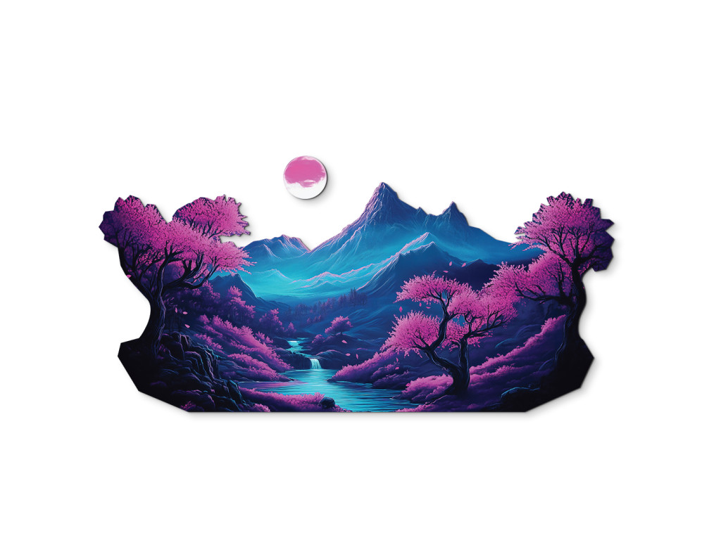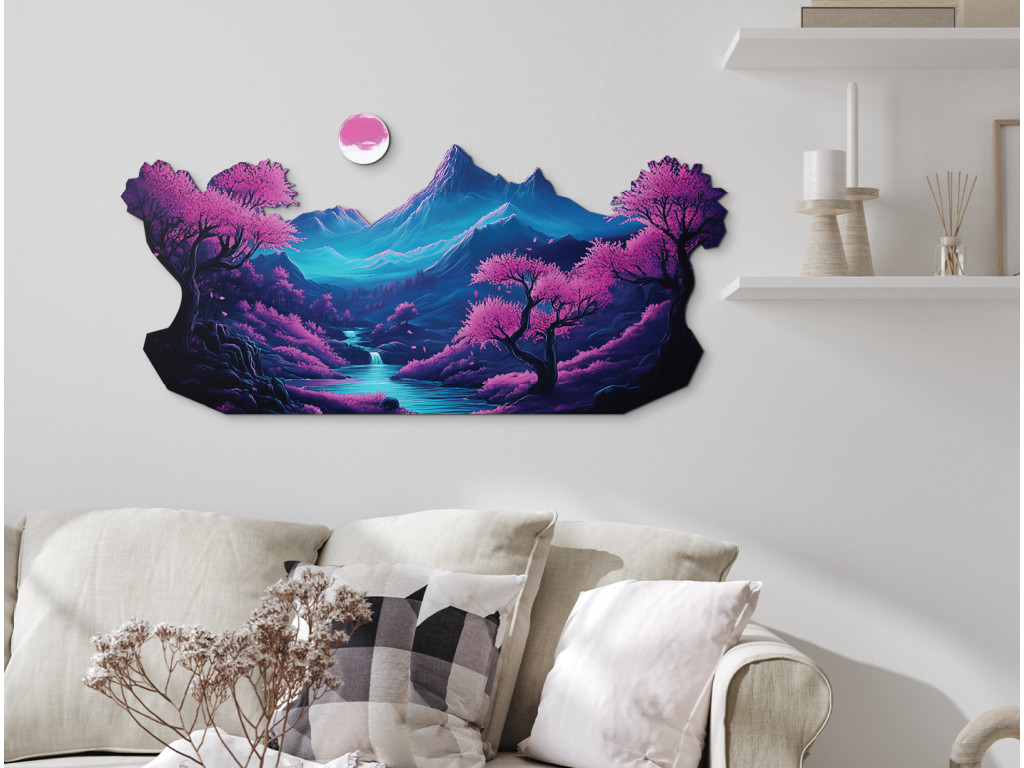 Pútavý obraz s fantazijnou krajinou zachytáva modro-fialové pohorie, ružovkasté slnko a rieku tečúcu údolím obklopeným stromami s ružovými kvetmi sakury. Jemné odtiene modrej, ružovej a fialovej vytvárajú pokojnú, snovú atmosféru, ktorá do priestoru vnesie harmóniu, relax a dotyk mágie. Ideálny doplnok pre interiéry, ktoré hľadajú umelecký a upokojujúci akcent.
