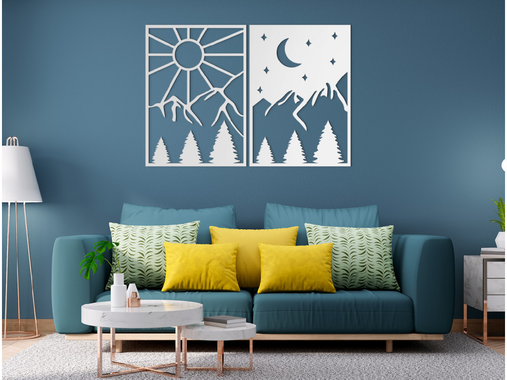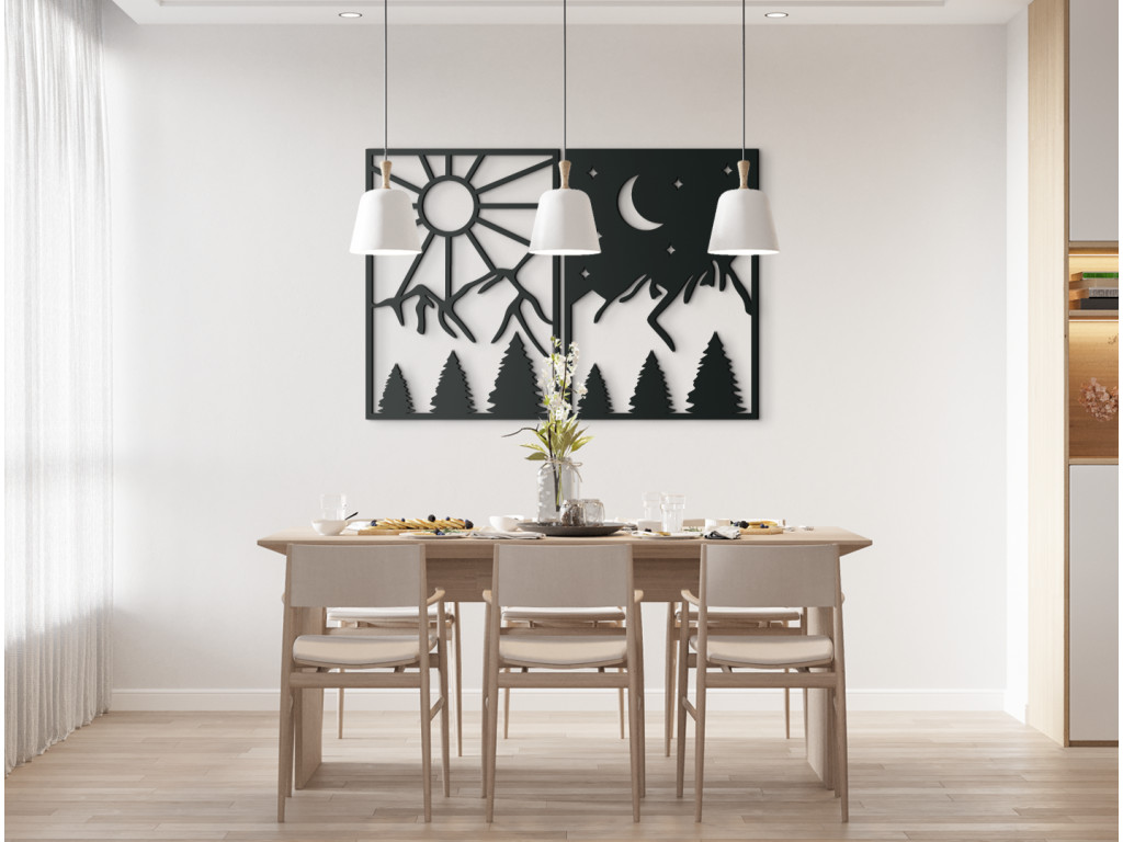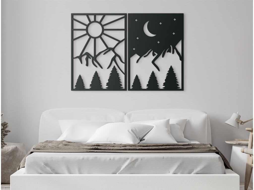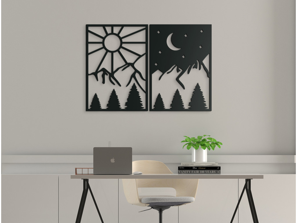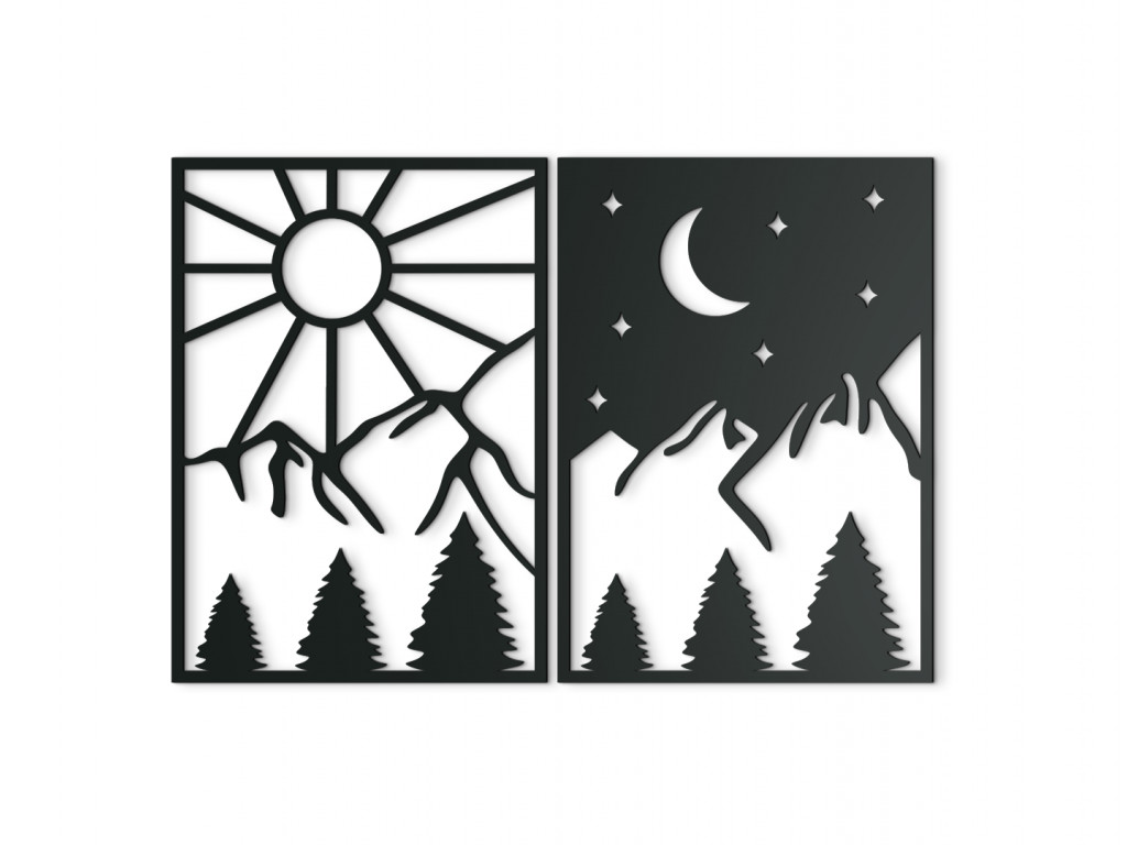 Na ľavom dieli sú taktiež vykreslené hory a nad nimi slnko s veľkými lúčmi. Vyrezávaný obraz Deň a Noc bude doplnkom, ktorý oceníte v kancelárii, obývačke aj spálni.