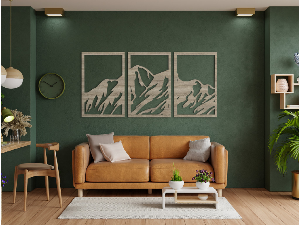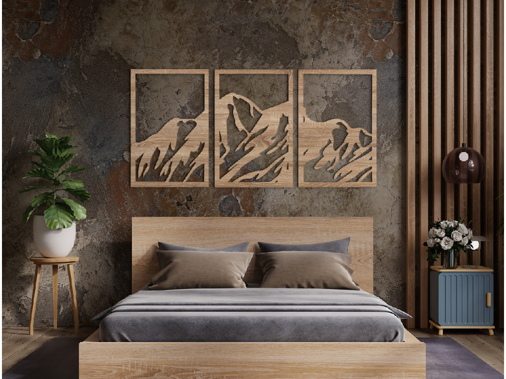 Drevený obraz Hory vnesie do interiéru originálny dizajn. Je vhodný do akejkoľvek miestnosti, kancelárie, bytu a iných priestorov. Obraz je zložený z 3 dielov, ktoré dokopy vytvárajú krásny pohľad na hory. Vybrať si môžete z viacerých farieb a rozmerov. Vneste do vášho interiéru kúsok prírody vďaka 3D obrazu.