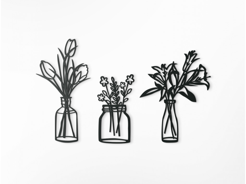Skrášlite interiér elegantnými kvetmi vo váze. Pokiaľ nebudete mať doma tie živé, ozdobu vám budú robiť drevené kvety. Moderná dekorácia sa skladá z 3 dielov. V prvej váze sú tulipány, druhá váza znázorňuje poľné kvety a v tretej žiaria ľalie. Každá váza ma iný tvar, preto na stene obraz vynikne. Dekorácia je vhodná do jedálne, kuchyne, chodby aj obývačky.