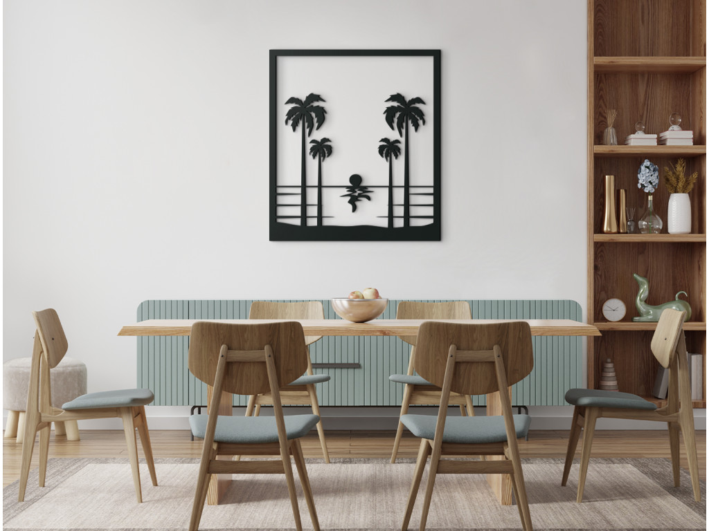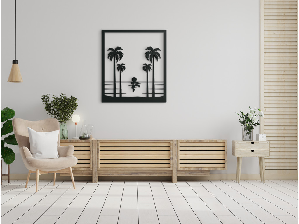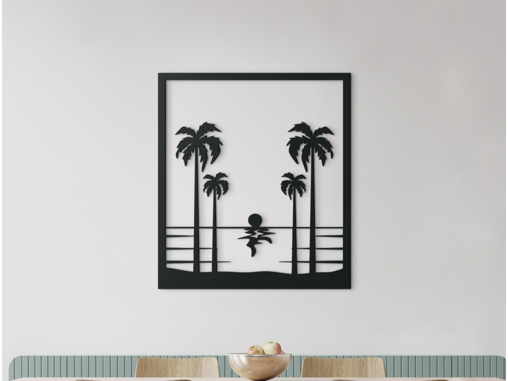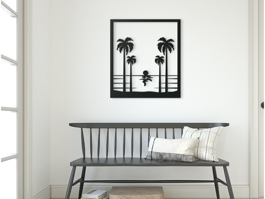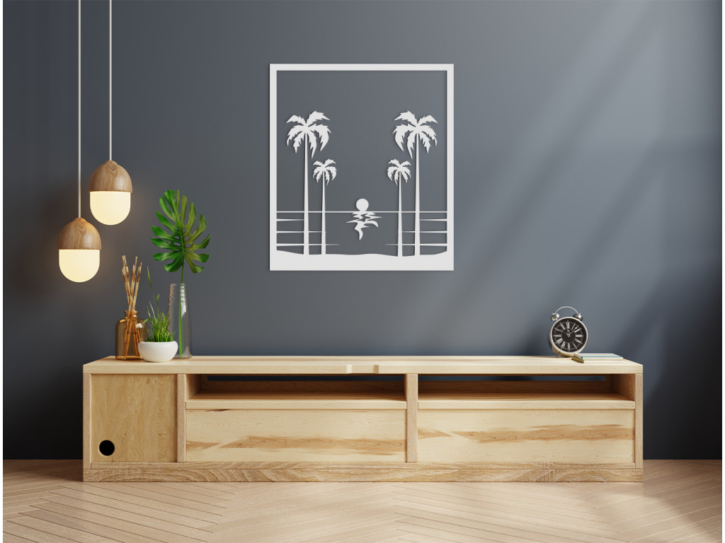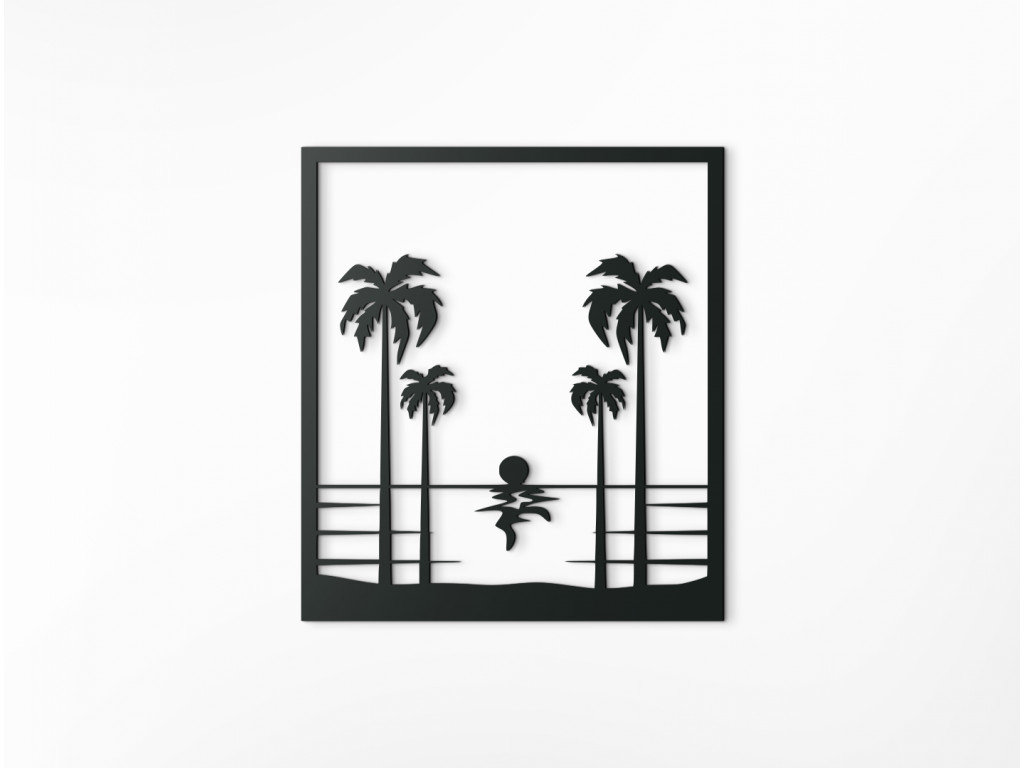 Drevený obraz Západ slnka, na ktorom sa nachádza more a exotické palmy. Jednoduchý dizajn z neho robí dekoráciu vhodnú do akejkoľvek izby. Obraz v minimalistickom dizajne je vyrobený z kvalitných materiálov. Vybrať si môžete z viacerých farebných prevedení.