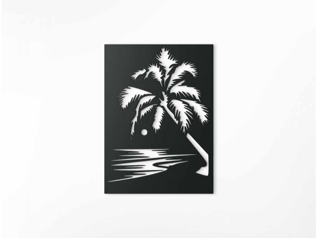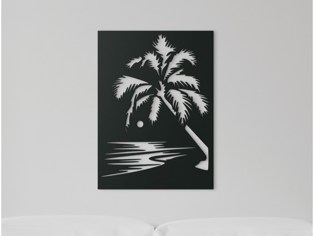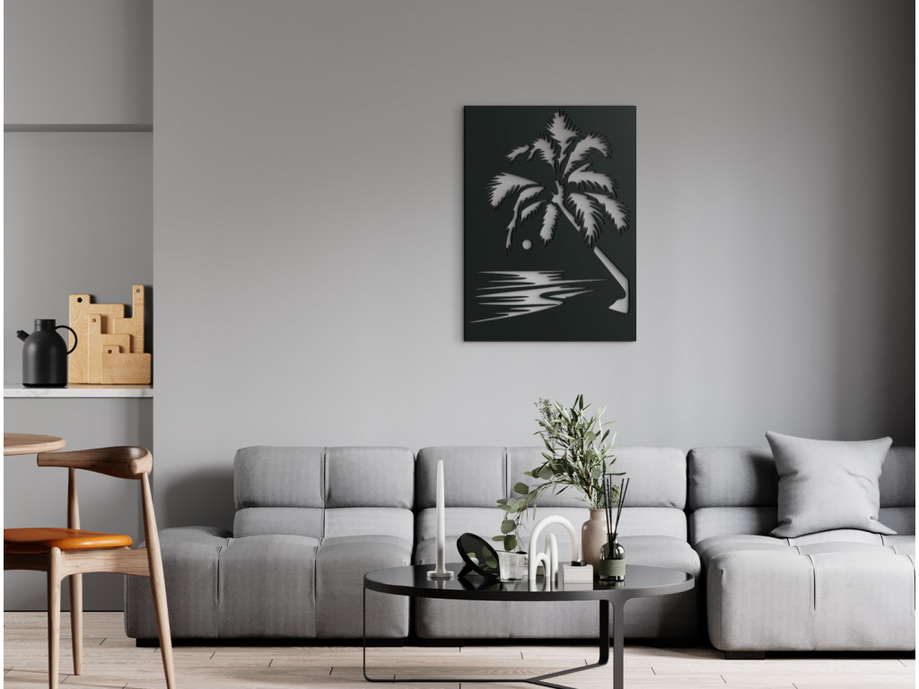 Nechajte vplávať kúsok exotiky do vášho domova. Drevený obraz vyobrazuje večerný príliv pri západe slnka. Romantike na obraze pridáva veľká palma. Jednoduchý a zároveň originálny obraz môžete zavesiť do obývačky, spálne, chodby aj kancelárie.