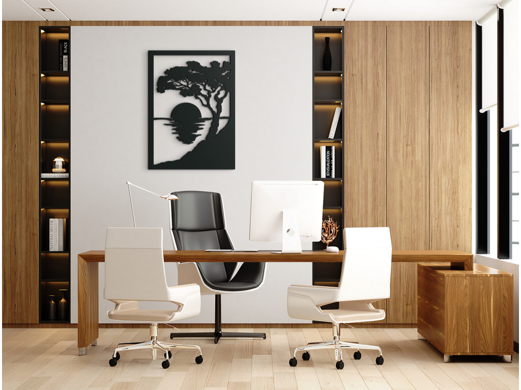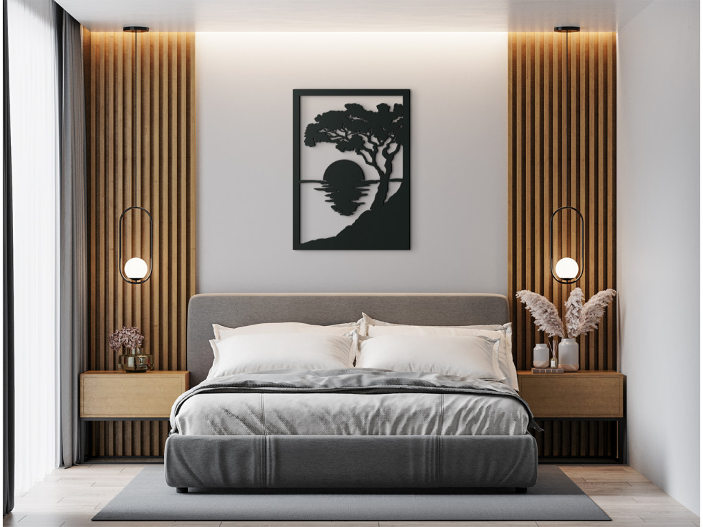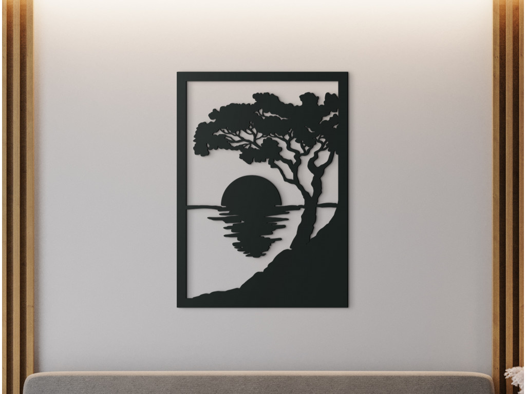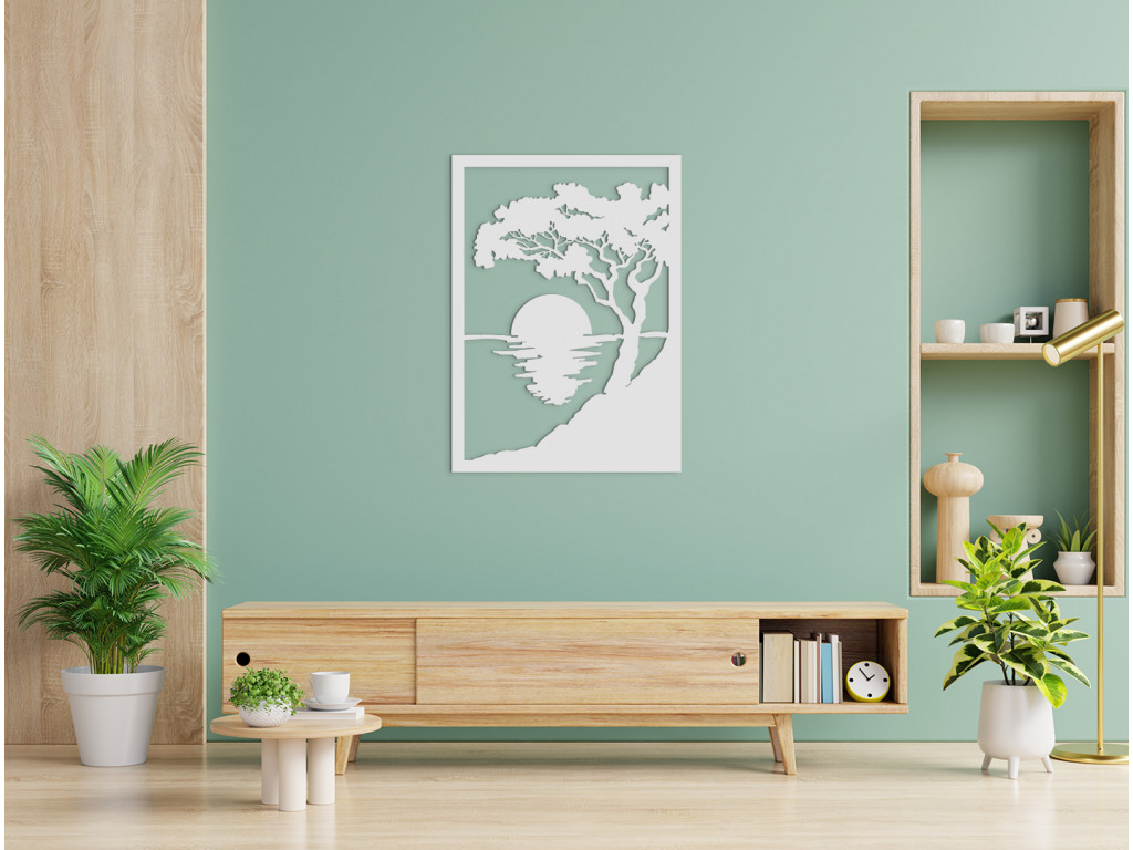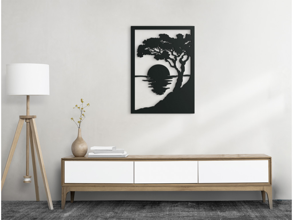 Nalepte si na stenu drevený obraz Západ slnka, na ktorom sa nachádza more a veľký strom. Jednoduchý dizajn z neho robí dekoráciu vhodnú do akejkoľvek izby. Obraz v minimalistickom dizajne je vyrobený z kvalitných materiálov. Vybrať si môžete z viacerých farebných prevedení.