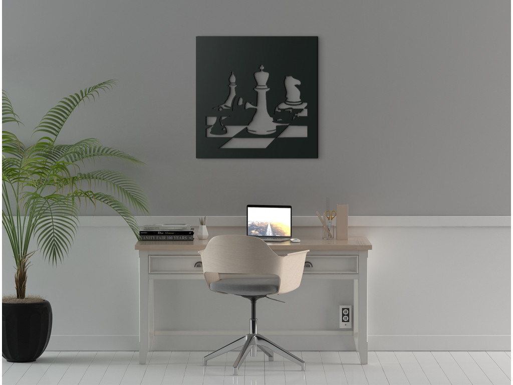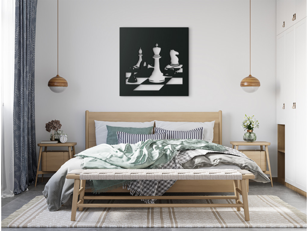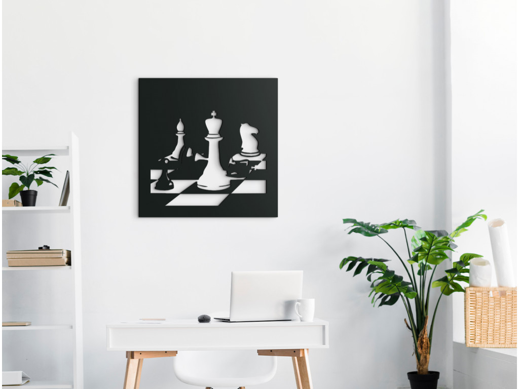 Drevený obraz Šach-mat vnesie do interiéru originálny dizajn. Hodí sa najmä do moderných interiérov nad posteľ, komodu či gauč. Na obraze nájdete šachové figúrky.