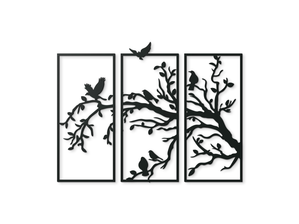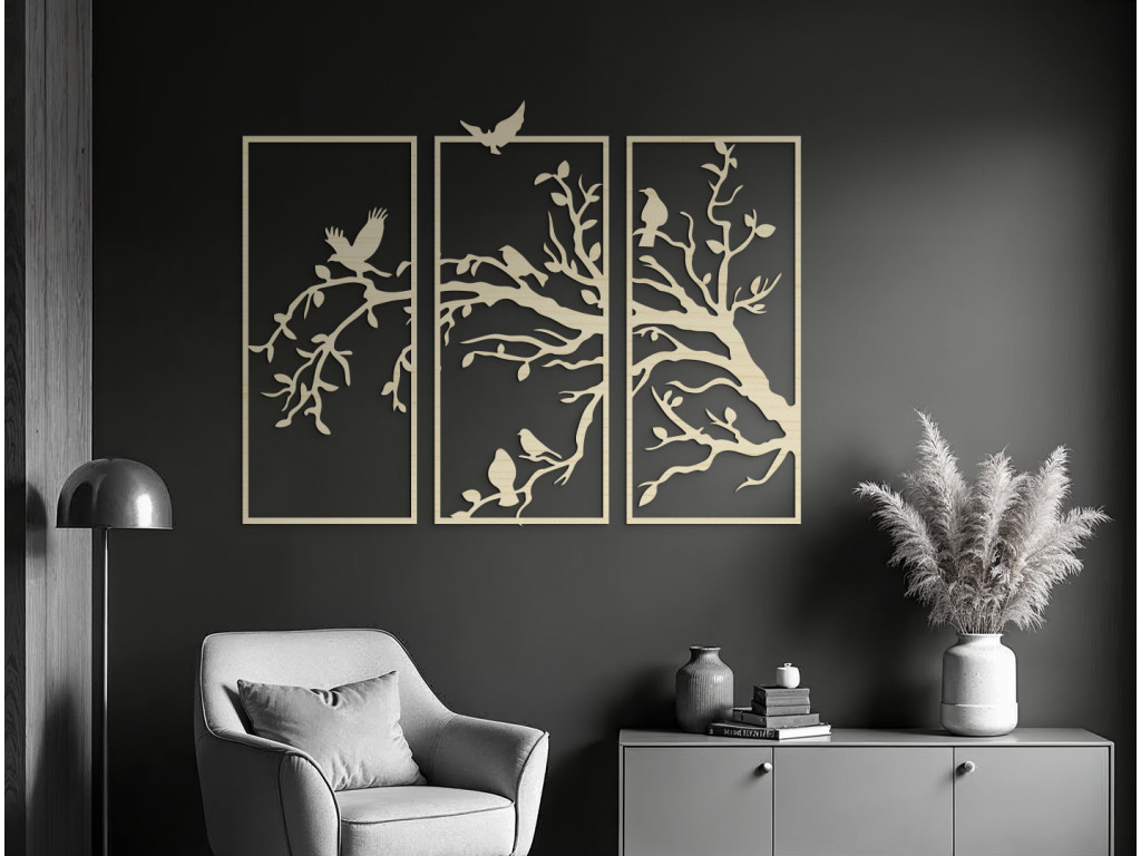 Trojdielny drevený obraz Vtáky na strome prináša do vášho domova živú scenériu plnú života a pohybu. Každý panel zobrazuje vtáčie rodiny na rozkvitnutom strome, čo vytvára dynamický a harmonický celok. Tento umelecký prvok oživí akúkoľvek stenu a dodá priestoru prirodzený a útulný charakter.