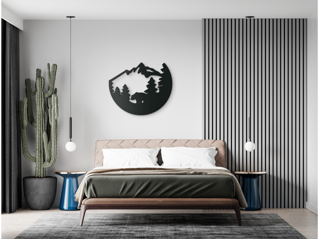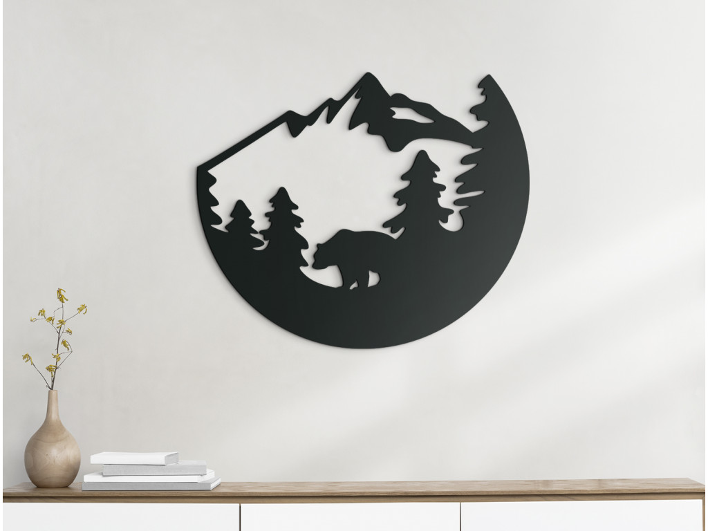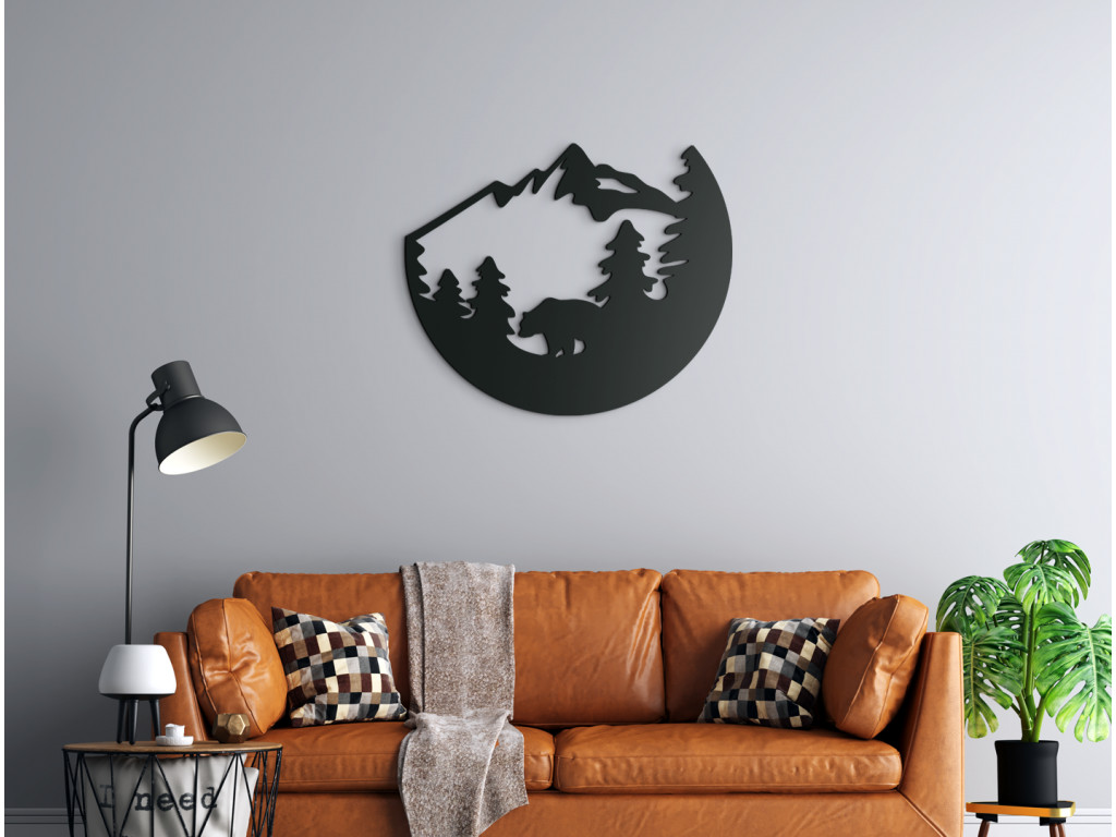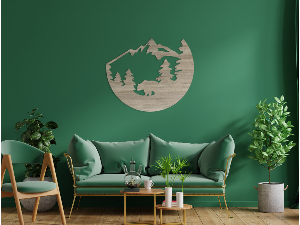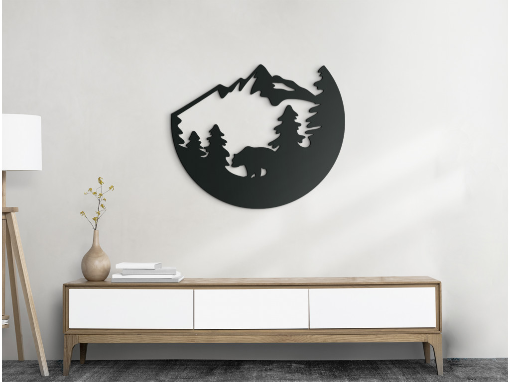 Elegantný obraz Medveď v lese je doplnkom, ktorý oceníte v každom modernom aj klasickom interiéri. Medveďa túlajúceho sa po lese obklopujú husté stromy. Za ním je vyobrazená vysoká hora, ktorá zároveň tvorí rám obrazu. Drevená dekorácia s medveďom dodá celej miestnosti prírodný charakter. Obrazom tiež potešíte milovníka hôr, poľovníkov či turistov.
