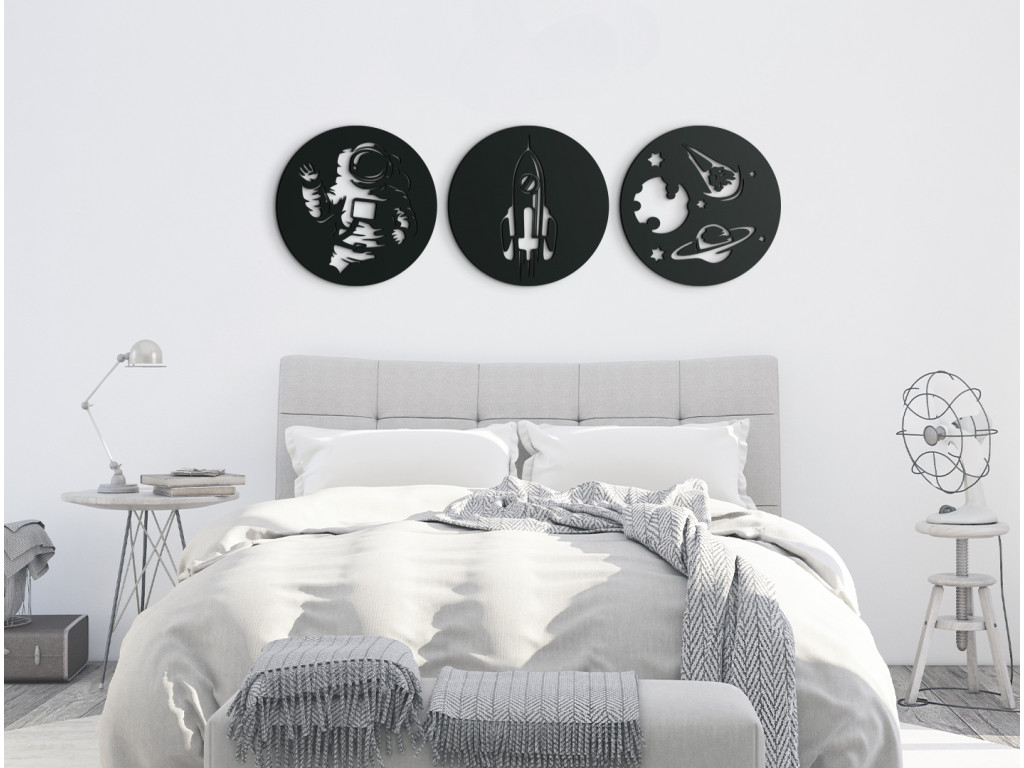 Vesmír a všetko, čo sa v ňom nachádza, pôsobí fascinujúcim dojmom. Dekorácia je vhodná pre malých aj veľkých astronautov. Skladá sa z 3 dielov. Na prvom je vyobrazený kývajúci astronaut, na druhom raketa a na treťom dieli sú zobrazené hviezdy, planéty a meteorit. Nálepka dodá interiéru originálnu atmosféru.
