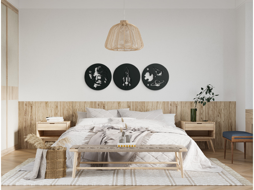 3-dielna drevená dekorácia na stenu sa stane obľúbeným kúskom v domácnosti. Drevená nálepka je vhodná nad posteľ, stôl, komodu. Hodí sa do moderných aj klasických detských izieb, obývačky aj spálne. Drevený obraz jednoducho zažiari v každej izbe.