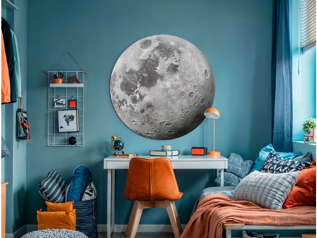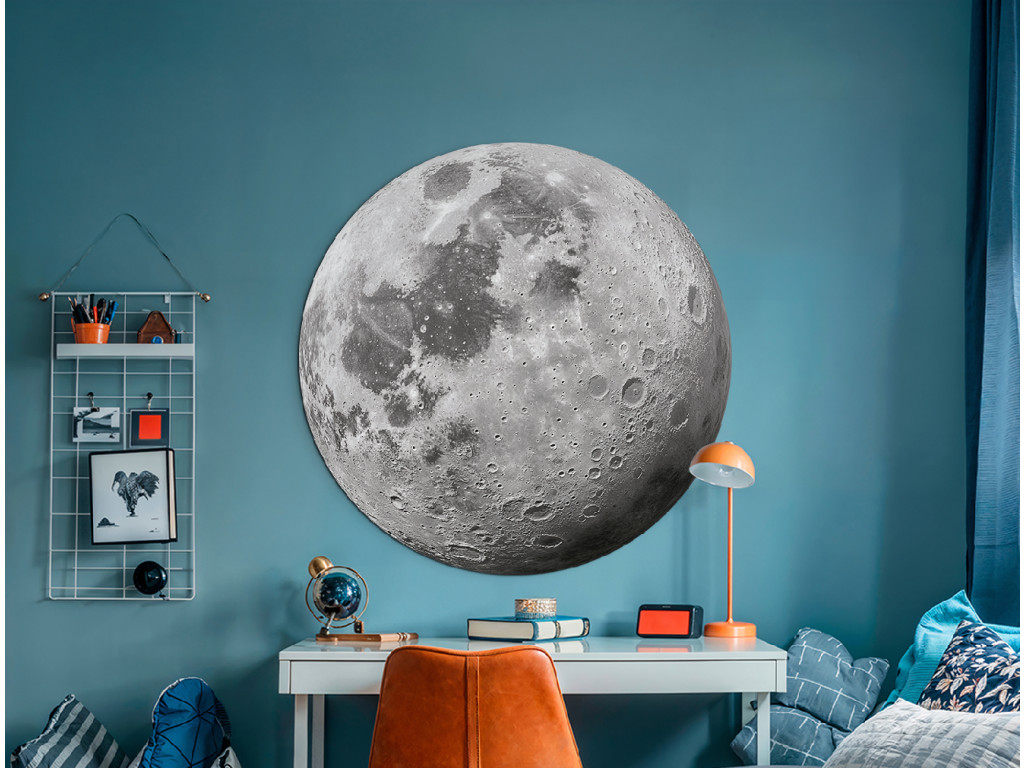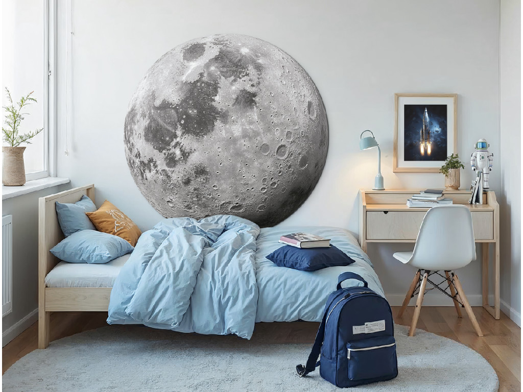 Táto pôsobivá nástenná dekorácia zobrazuje realistický detail mesiaca s viditeľnými krátermi a štruktúrou povrchu. Jemné odtiene sivej vytvárajú prírodný dojem, vďaka ktorému sa dekorácia hodí do detskej izby aj do moderného interiéru. Ideálna voľba pre milovníkov vesmíru, estetiky a pokojnej atmosféry.