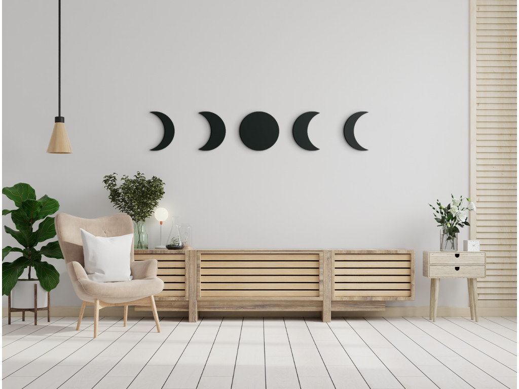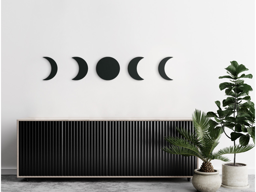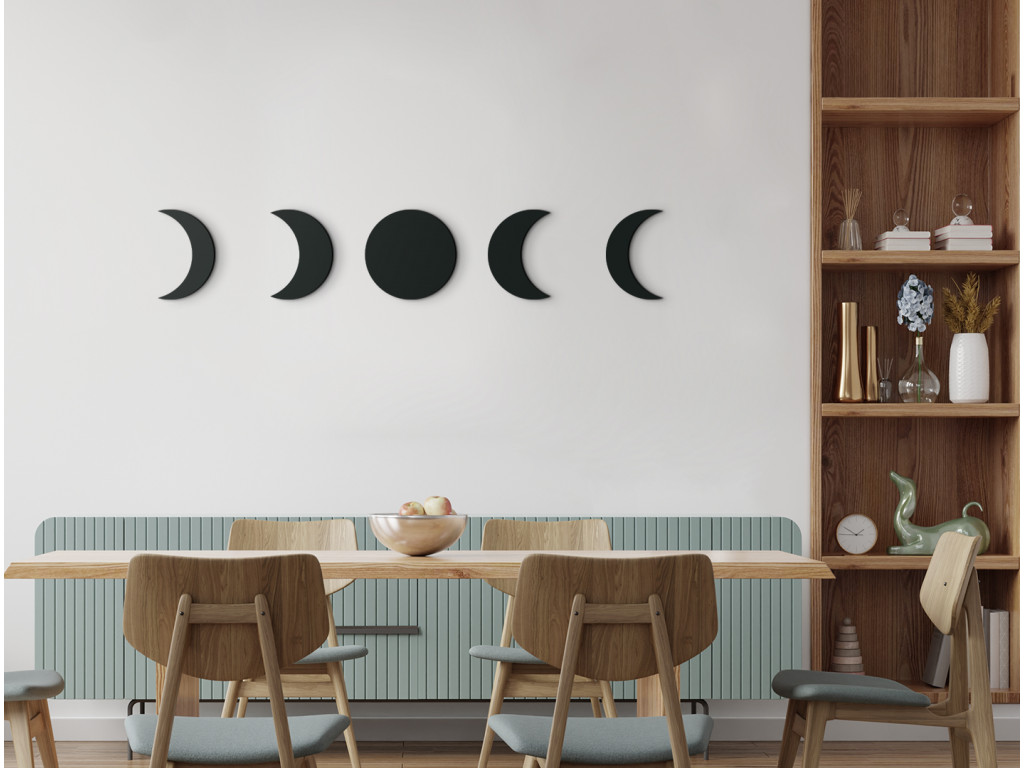 Moderná nálepka na stenu s témou Mesiaca vynikne v každom interiéri. Dekoráciu tvorí až 5 dielov, ktoré spolu súvisia a vytvárajú nádherný obraz do modernej obývačky. Na konkrétnych dieloch sú vyobrazené niektoré fázy Mesiaca.