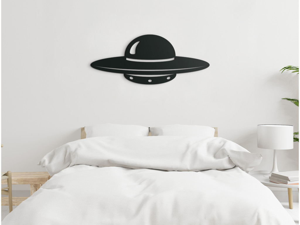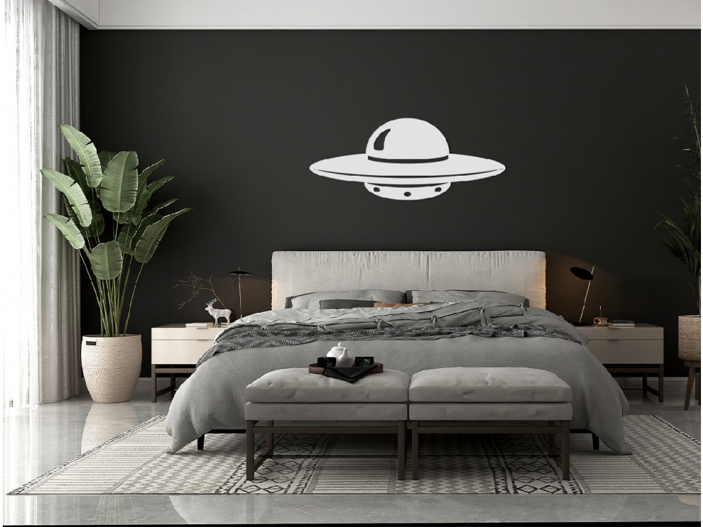 Vyrezávaná nálepka na stenu UFO bude v miestnosti vynikať svojím zaujímavým dizajnom. Dekorácia vyobrazuje vznášajúci sa lietajúci tanier. Vďaka svojmu jednoduchému, no precíznemu vyhotoveniu ľahko zapadne do obývačky, detskej izby i spálne.