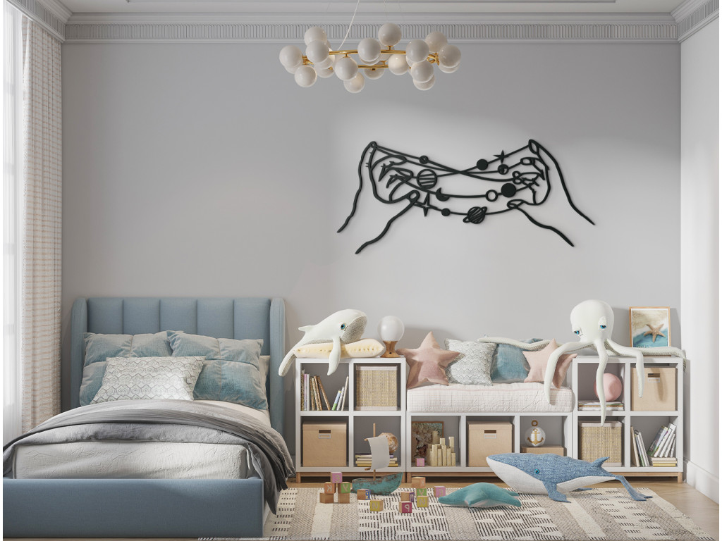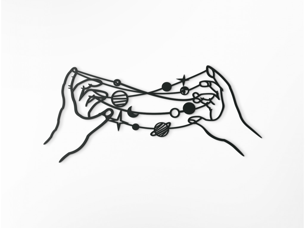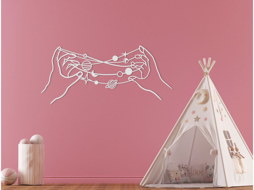 Oživte vašu stenu umeleckou dekoráciou, z ktorej nespustíte oči. Planéty v tomto prípade držia na lankách dve ruky, ktoré nálepke pridávajú na jedinečnosti. Nájdete tam všetky planéty slnečnej sústavy vrátane hviezd, Slnka a Mesiaca. Moderný dizajn sa hodí do detskej izby, spálne či obývačky.