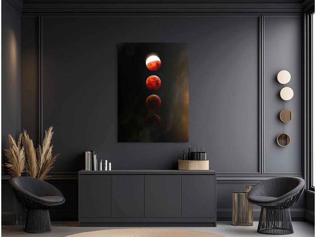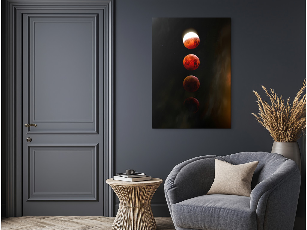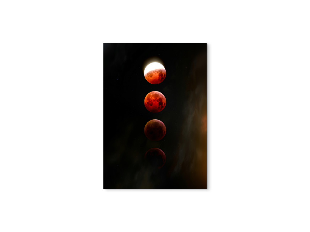 Obraz zachytáva úplné zatmenie Mesiaca, pri ktorom sa Mesiac ponorí do tieňa Zeme a získa typický červenkastý odtieň. Tento jav vytvára dramatickú a tajomnú atmosféru nočnej oblohy. Vďaka UV tlači vyniknú jemné prechody farieb a obraz sa hodí do moderného interiéru alebo pracovne pre milovníkov astronómie.