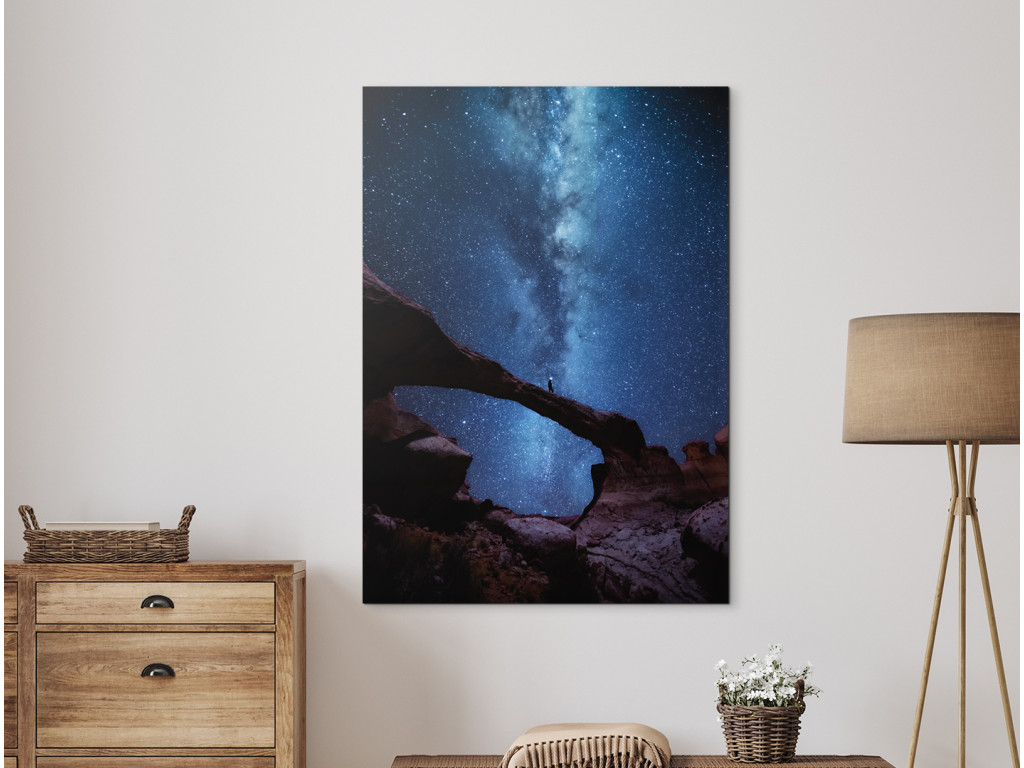 Mliečna dráha žiariaca nad prírodným skalným oblúkom vytvára pôsobivý kontrast medzi zemou a nekonečným vesmírom. Nočná obloha dodáva obrazu hĺbku a pocit úžasu. Vďaka UV tlači vyniknú detaily hviezd a obraz sa hodí do obývačky alebo pracovne pre milovníkov prírody a nočnej oblohy.