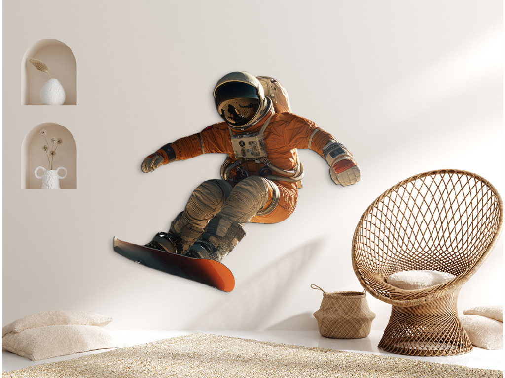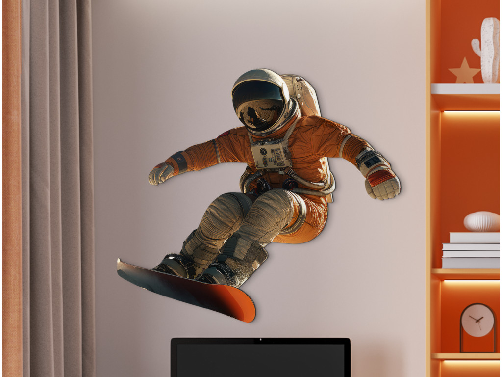 Vyrezaný obraz astronauta v oranžovom skafandri na snowboarde pôsobí hravo a dynamicky. Spojenie vesmíru a extrémneho športu vytvára originálny sci-fi motív plný pohybu. Vďaka kvalitnej UV tlači je ideálny do moderného interiéru, detskej izby alebo herne pre tých, ktorí majú radi netradičný dizajn a fantáziu.