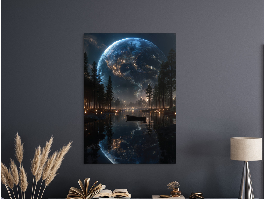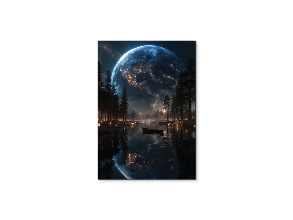 Pokojná nočná scéna s obrovskou planétou odrážajúcou sa na hladine jazera pôsobí snovo a tajomne. Vďaka UV tlači vyniknú kontrasty svetla a tmy aj jemné detaily. Obraz sa hodí do obývačky alebo spálne, kde navodí ticho, pokoj a priestor na fantáziu.