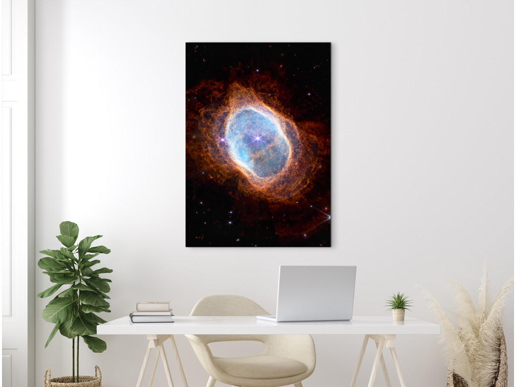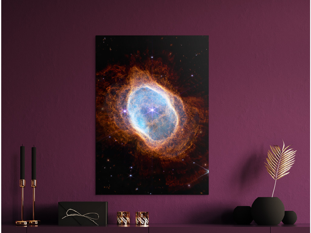 Snímka planetárnej hmloviny Southern Ring Nebula, zachytená teleskopom James Webb Space Telescope, ukazuje expandujúci oblak plynu a prachu okolo umierajúcej hviezdy. Jemné štruktúry a žiarivé farby odhaľujú krásu kozmického zániku. Vďaka UV tlači pôsobí obraz výrazne a hodí sa do moderného interiéru alebo priestoru, kde má vyvolávať úžas a zamyslenie.