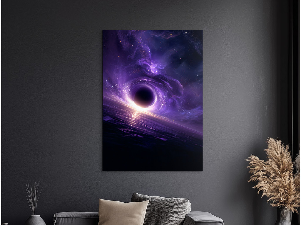 Umelecká vizualizácia čiernej diery zachytáva hranicu, za ktorou už neexistuje návrat ani svetlo. Temný stred a dramatické zakrivenie priestoru pôsobia tajomne a silno. Vďaka UV tlači vynikne kontrast a hĺbka obrazu, ktorý sa hodí do moderného interiéru alebo pracovne pre milovníkov vedy, vesmíru a abstraktných motívov.