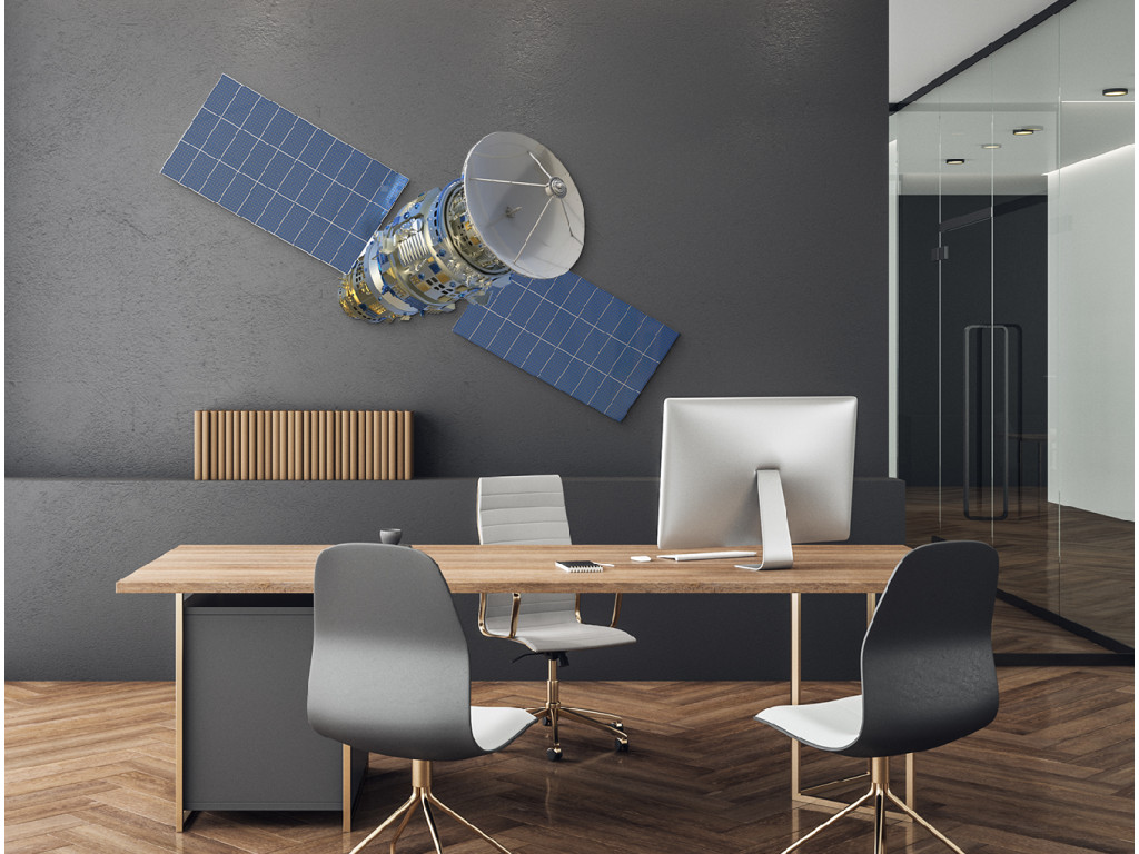 Detailný obraz zobrazuje umelú družicu Zeme so solárnymi panelmi a komunikačnou anténou. Čisté spracovanie zvýrazňuje technický dizajn a funkčnosť satelitu. Obraz sa hodí do moderného interiéru, kancelárie alebo vzdelávacieho priestoru, kde podčiarkne záujem o technológie a vesmír.