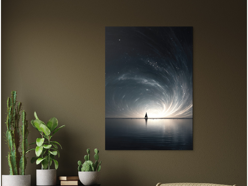 Obraz osamelej plachetnice pod víriacou hviezdnou oblohou pôsobí snovo a pokojne. Kontrast tichej vody a dramatického žiariaceho neba vytvára pocit slobody a rozjímania. Vďaka UV tlači vyniknú farby aj pohyb oblohy a obraz sa hodí najmä do spálne alebo obývačky pre milovníkov poetických motívov.