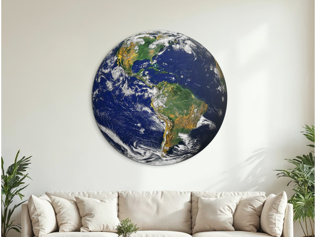 Okrúhly farebný obraz planéty Zem zaujme sýtymi farbami a výrazným detailom povrchu. Kvalitná UV tlač zvýrazňuje oceány, kontinenty aj jemnú atmosféru. Obraz sa hodí do moderného interiéru alebo pracovne a pôsobí ako čistý, harmonický prvok s vesmírnou témou.