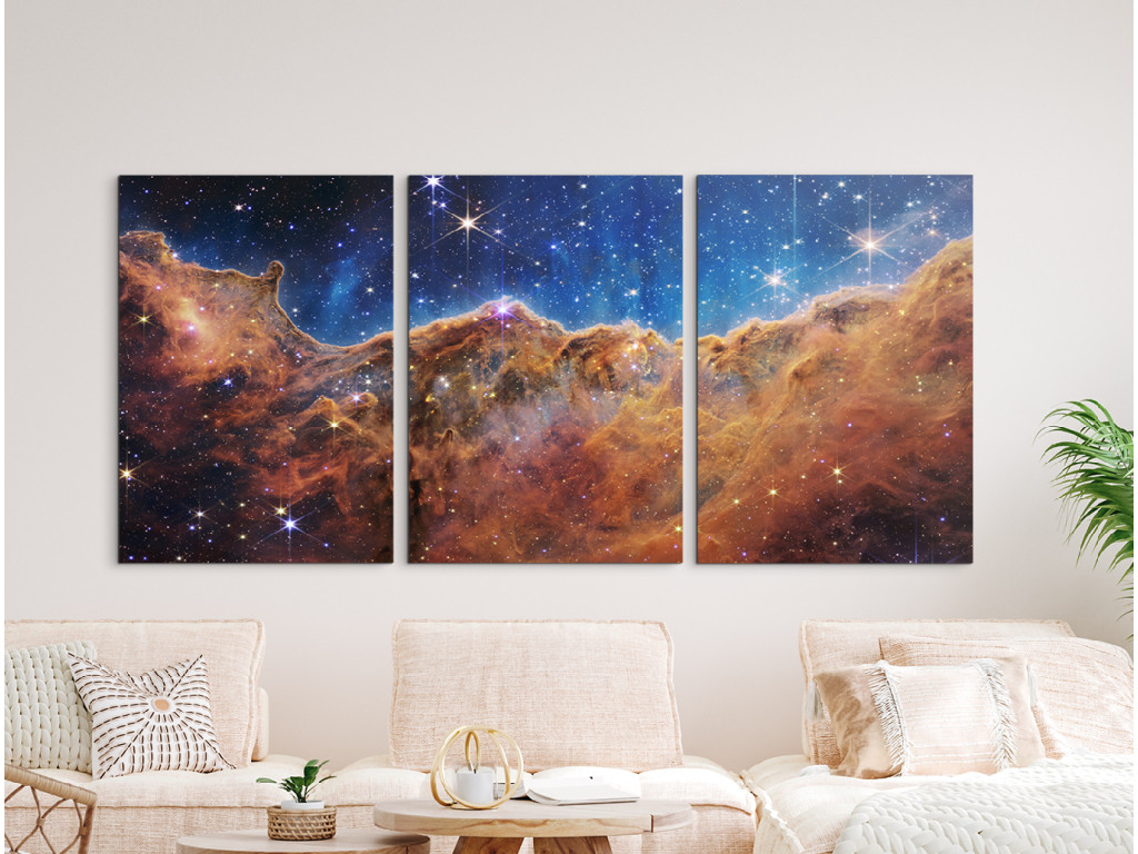 Slávny obraz Cosmic Cliffs z hmloviny Carina, zachytený teleskopom James Webb Space Telescope, odhaľuje dramatické steny plynu a prachu formované mladými hviezdami. Triptych zvýrazňuje hĺbku, štruktúru a energiu oblasti, kde neustále vznikajú nové hviezdy. Vďaka UV tlači pôsobia farby mimoriadne sýto a obraz sa hodí do moderného interiéru, kancelárie alebo priestoru, ktorý má vzbudzovať úžas a inšpiráciu.