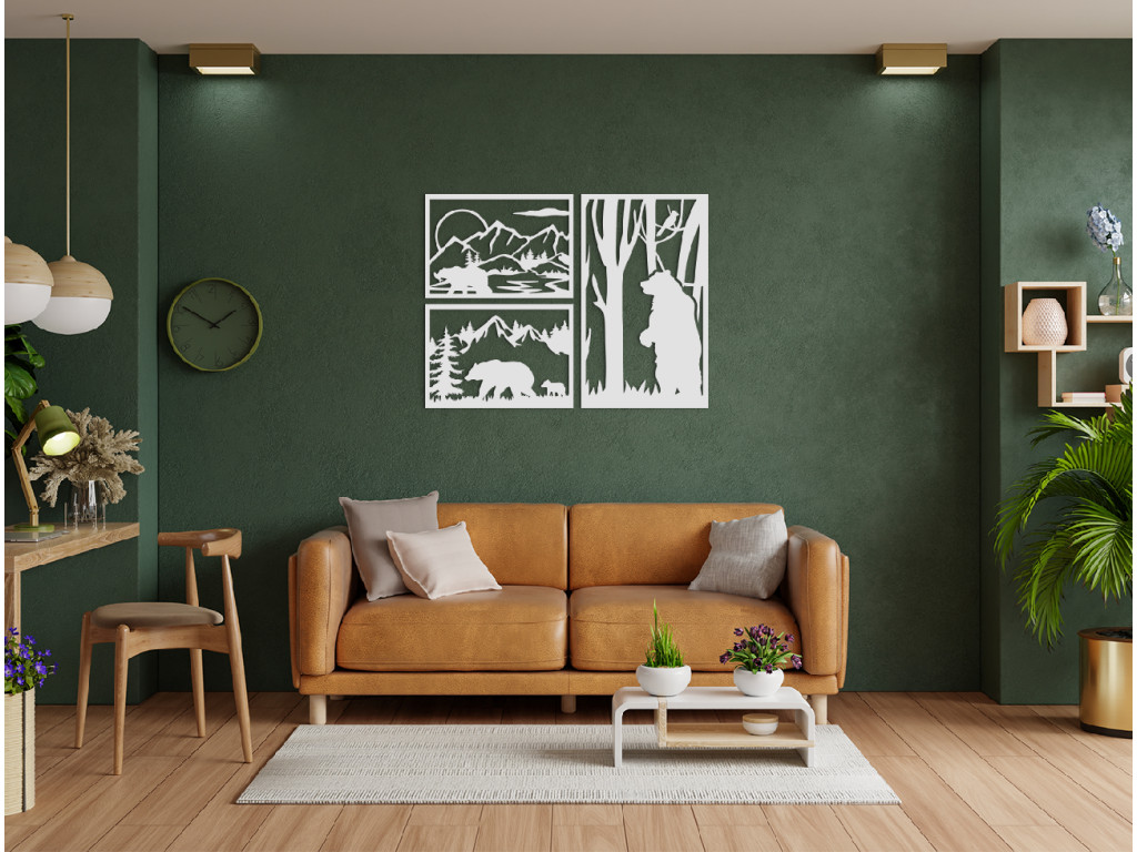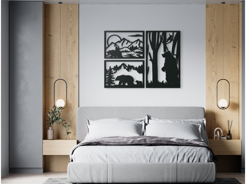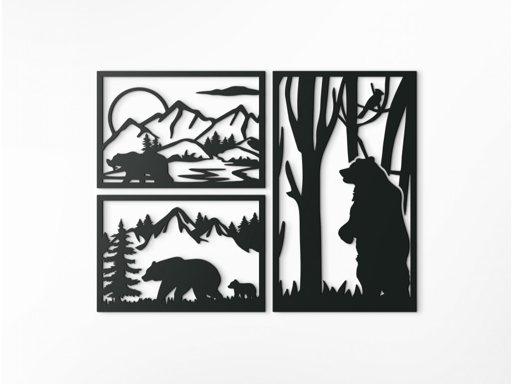 Drevený obraz na stenu Medvedí triptych zobrazuje tri rozličné scény zo života medveďov. Prvá nálepka predstavuje hornatú krajinu s medveďom v popredí, ktorý si v pysku odnáša ulovenú rybu z rieky. Druhý obraz ponúka pohľad na medvedicu s malým medvieďaťom, ako kráčajú po lese a za nimi čnejú do výšky horské masívy. Tretí a najväčší obraz znázorňuje medveďa stojaceho na dvoch nohách so stromami v pozadí.