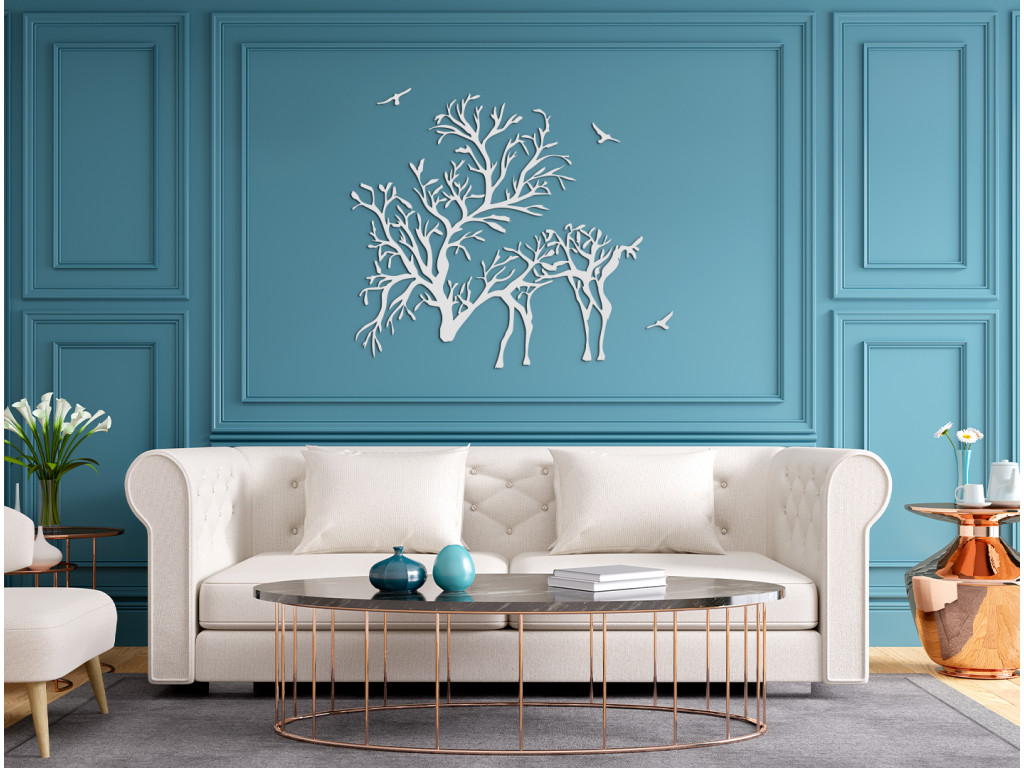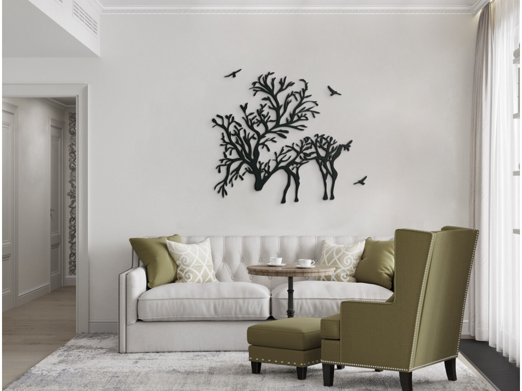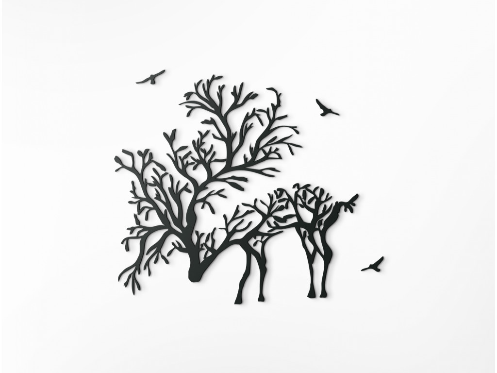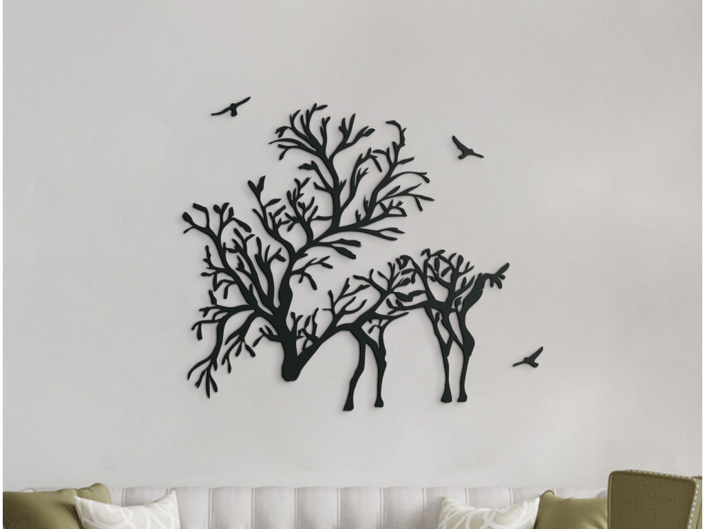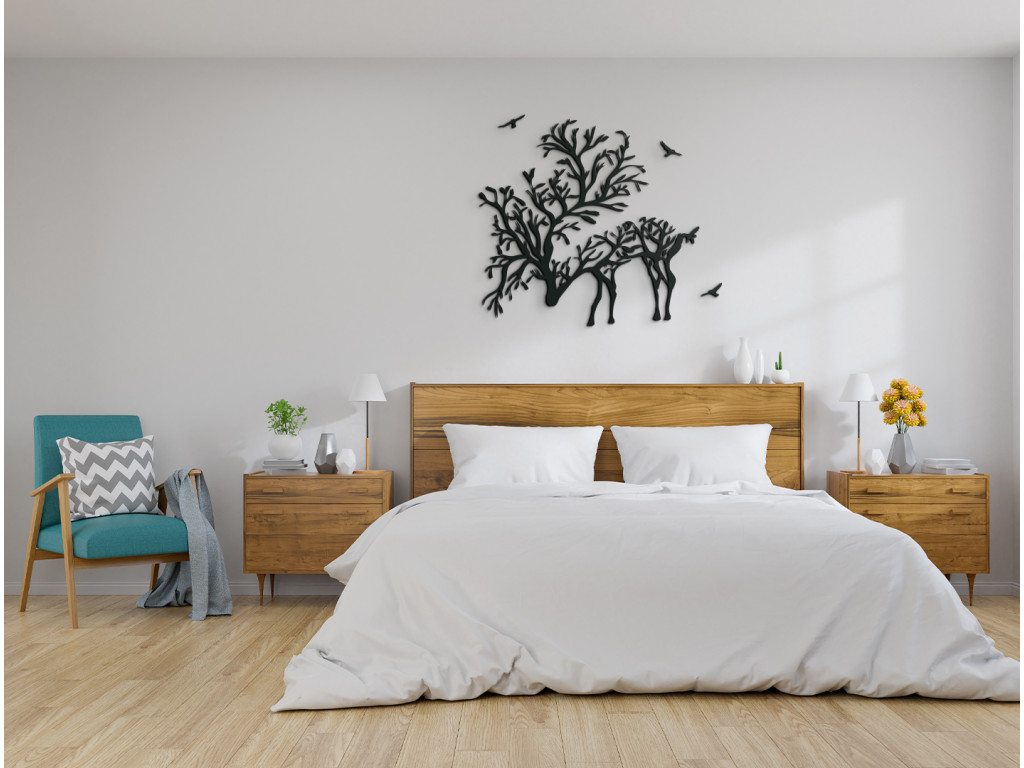 Dodajte vášmu interiéru elegantný dizajn s efektnou nálepkou na stenu. Je na nej vyobrazený jeleň s parohami pripomínajúcimi konáre stromov. Drevený obraz je ideálny do moderných aj klasických interiérov, chát, kancelárií a iných priestorov. Tiež bude ideálnym darčekom pre poľovníkov a milovníkov zvierat.