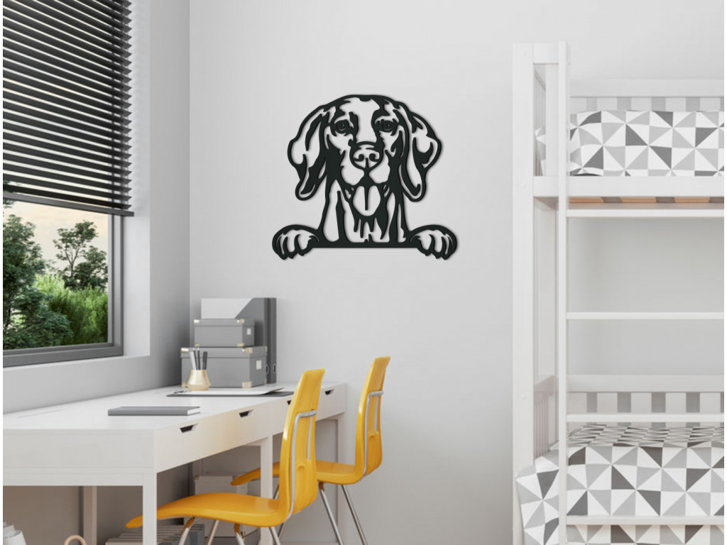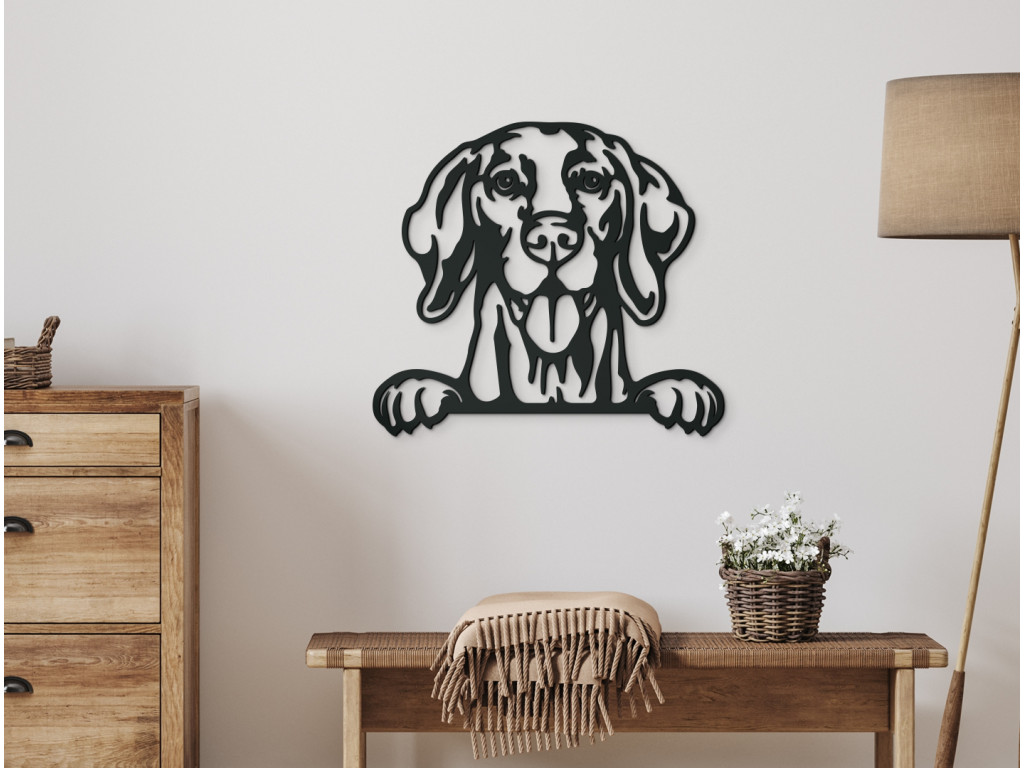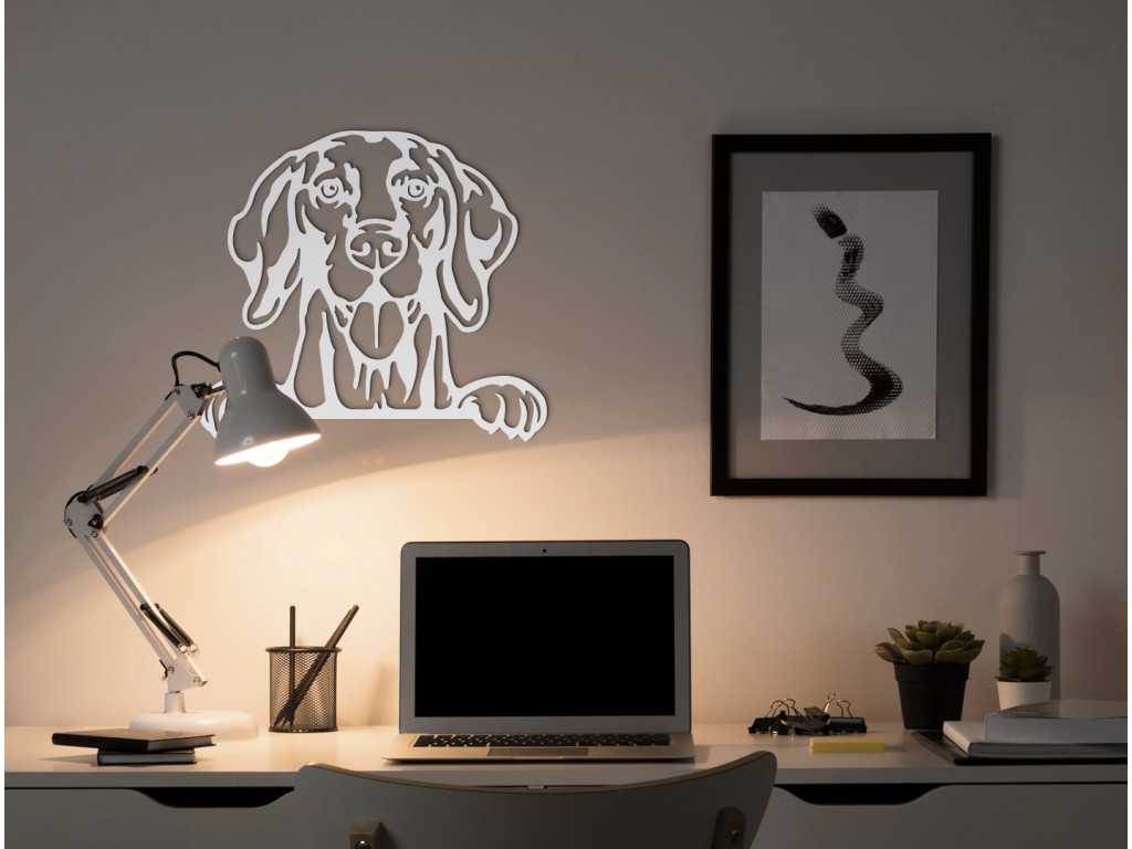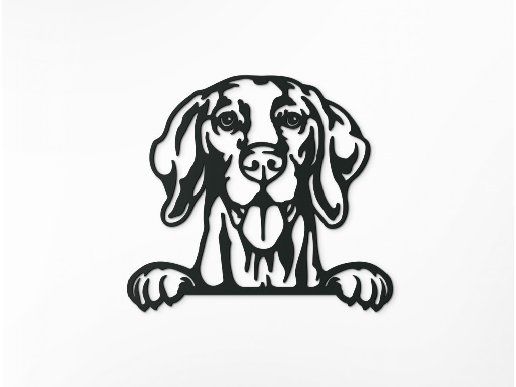 Distingvovaný pes stredne veľkého vzrastu so štíhlou línou zaujme na prvý pohľad nielen v realite, ale aj na obraze. Portrét zobrazuje Weimara, s pôvodným názvom Weimaraner, s vyplazeným jazykom a zdvihnutými prednými labami. 3D nálepku na stenu si môžete zvoliť vo viacerých odtieňoch dekoru podľa farby srsti vášho domáceho maznáčika alebo štýlu interiéru. Kategoricky ho zaraďujeme medzi poľovné psy, ktoré boli a sú využívané pri tichom love zvery vďaka výbornému čuchu, ostražitosti a sledovacím schopnostiam. Vďaka typickým črtám stavača sa drevenej nálepky potešia aj majitelia plemena maďarský stavač, vyžla a ďalších z príbuznej genetickej skupiny.